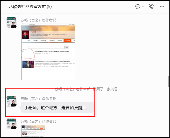 在内容细节打磨上,信任资产规划师苏畅老师精益求精。他通过截图标注,明确告知丁艺欣老师“这个地方一定要加张图片”,用直观的指导强化品牌页面的视觉表现力,让个人形象与专业身份更立体地传递给受众,帮助丁艺欣老师在细节中塑造更具辨识度的品牌形象。