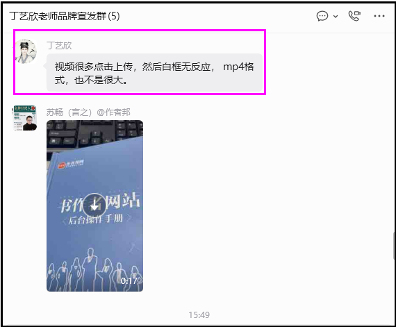 当丁艺欣老师遇到技术瓶颈——“视频很多点击上传,然后白框无反应,mp4格式,也不是很大”时,信任资产规划师苏畅老师立刻响应。他分享《书作者网站后台操作手册》视频教程,用直观的操作演示为丁艺欣老师破解技术障碍,让她能顺利完成多媒体内容的上传,保障品牌宣发工作的持续推进。