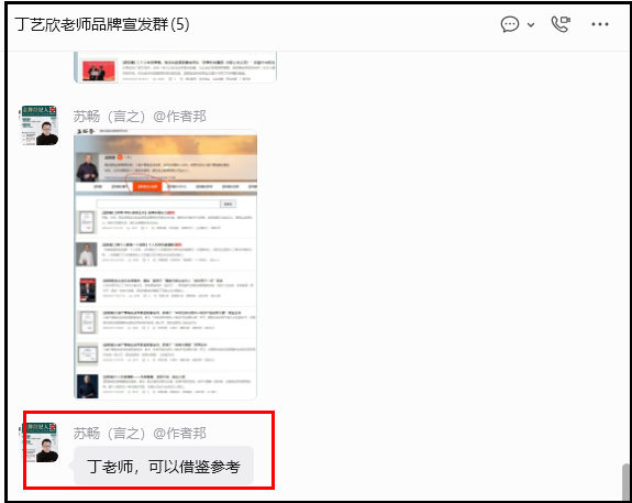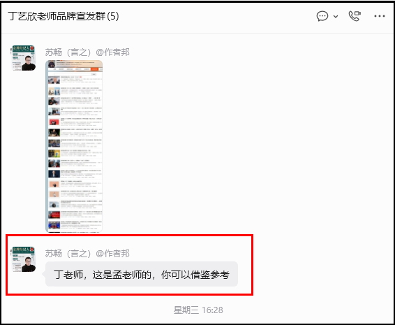 在丁艺欣老师品牌宣发的起步阶段,信任资产规划师苏畅老师率先伸出援手。他主动分享周老师、孟老师的成熟网站案例,附上清晰的页面截图与网站链接,让丁艺欣老师能直观借鉴专业的品牌呈现形式,快速建立起对个人品牌宣发的认知框架,为后续工作锚定了清晰方向。