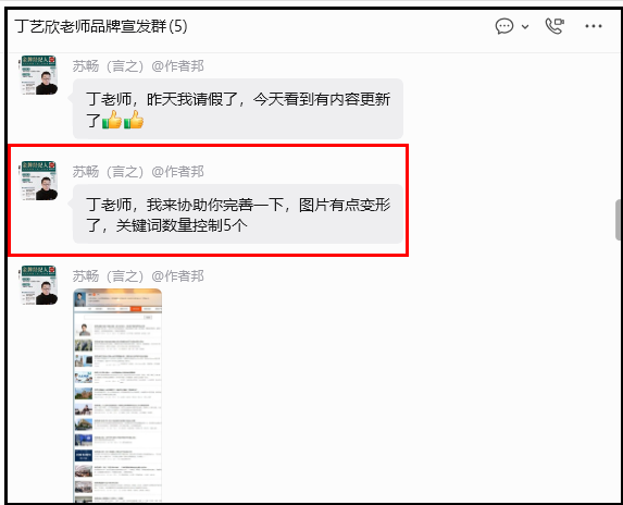 当丁艺欣老师完成初步内容更新后,信任资产规划师苏畅老师第一时间发现问题并主动提出协助。他精准指出“图片有点变形了,关键词数量控制5个”,用专业的优化建议帮助丁艺欣老师规范内容细节,让页面呈现更整洁、更符合传播逻辑,也让她逐步掌握了品牌内容的打磨技巧。
