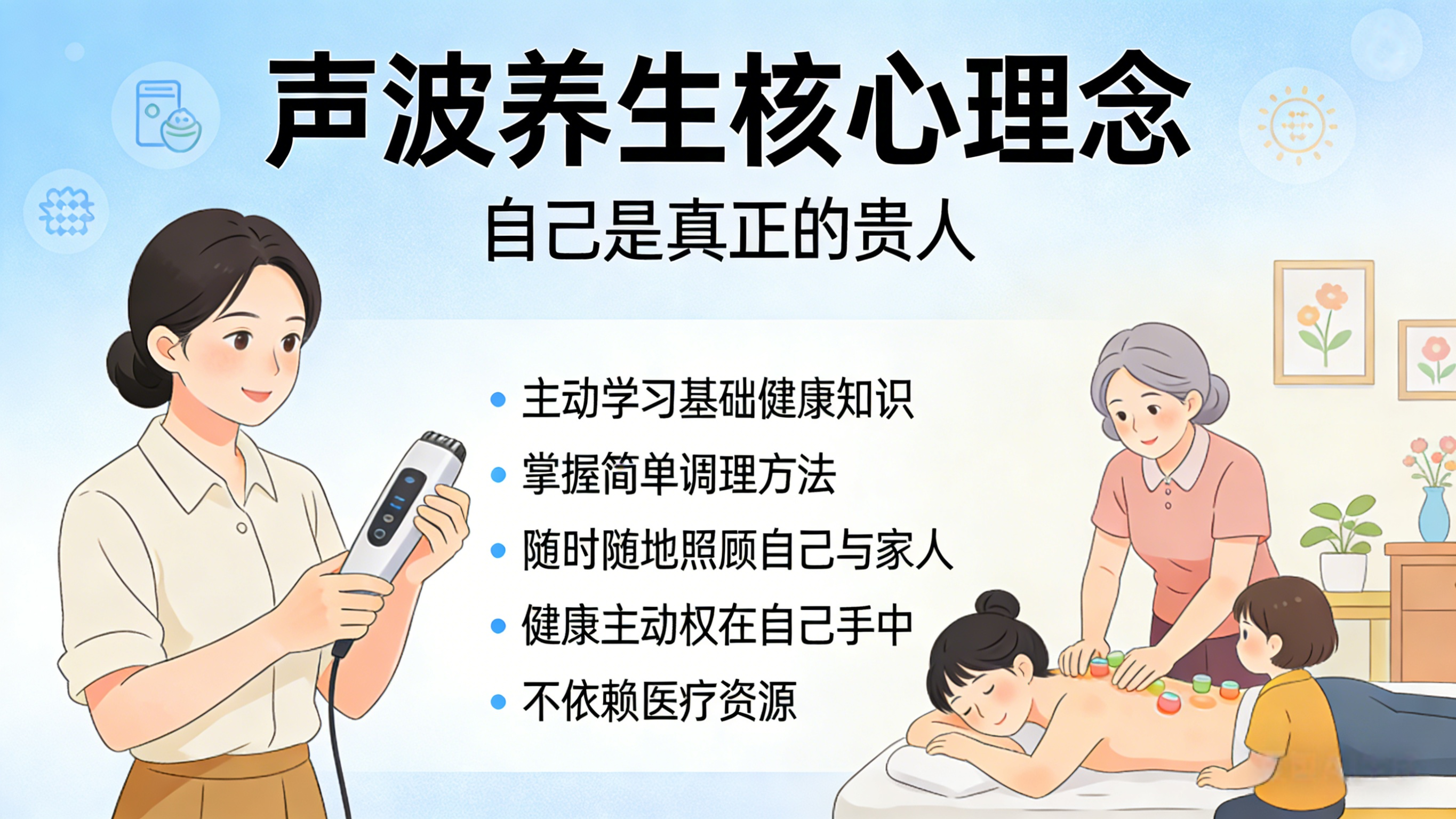 声波养生的核心理念在于“自己是真正的贵人”,即通过教育与实践,培养个人的自我保养与自愈能力。它倡导人们主动学习基础健康知识,掌握简单易行的调理方法,随时随地照顾自己与家人的健康,将健康主动权掌握在自己手中,而非过度依赖医疗资源。