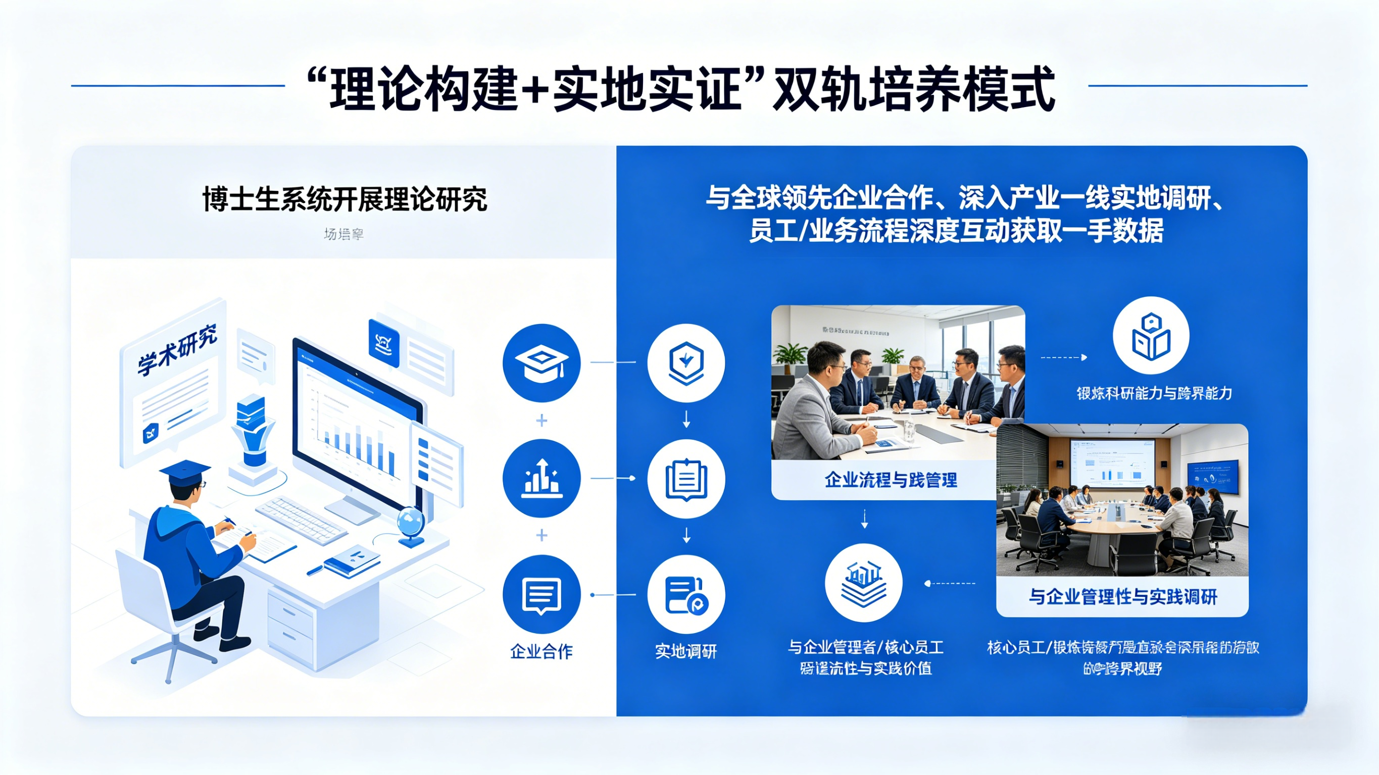 项目采用“理论构建+实地实证”双轨培养模式,以发表高水平学术成果为导向。博士生将系统开展理论研究,同时与全球领先企业合作伙伴紧密协作,深入产业一线进行实地调研,定期与企业管理者、核心员工及业务流程深度互动,获取一手研究数据。这种培养模式打破纯理论研究局限,让学术探索扎根真实商业场景,既保证研究的严谨性,又提升成果的实践价值,全面锻炼博士生的科研能力与跨界视野。