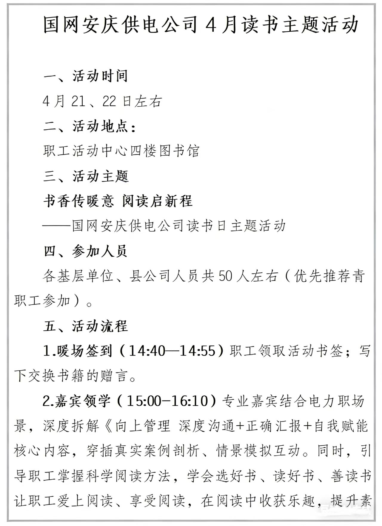 在世界读书日来临之际,国网安庆供电公司以“书香传暖意 阅读启新程”为主题,精心筹备4月读书主题活动,为广大职工搭建起以书为媒、赋能成长的学习平台。本次活动聚焦青年职工职场发展需求,特别邀请知名职场导师王楠老师,围绕《向上管理 深度沟通+正确汇报+自我赋能》一方面用专业知识和电力职场人破解成长难题,让书香浸润职场,让阅读点亮前行之路。