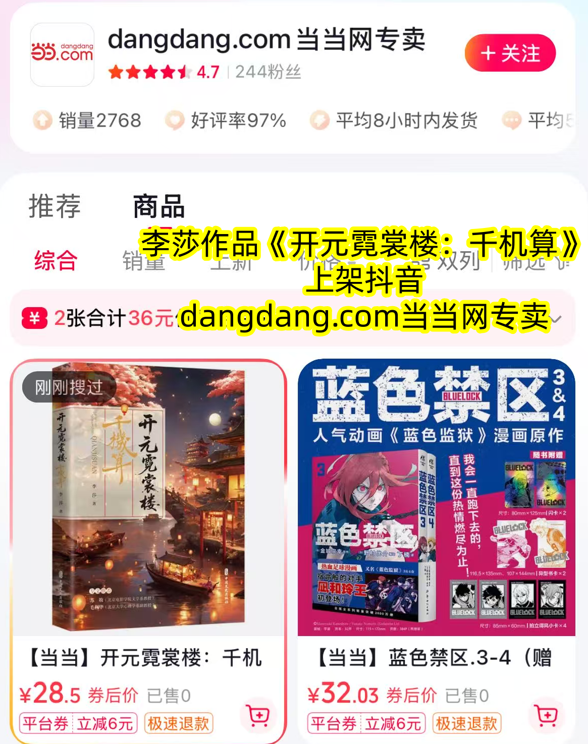 抖音作为国内领先的短视频与电商融合平台,不仅拥有庞大用户基数,更凭借全域兴趣电商模式,推动文化消费成为新增长点。此次《开元霓裳楼:千机算》以商品形式上架抖音,依托平台精准算法、流量扶持及店铺直播优势,打破传统书籍销售的地域限制,让不同圈层的用户既能了解书籍亮点,也能直接点击购买,实现“看即购、购即读”的便捷体验。