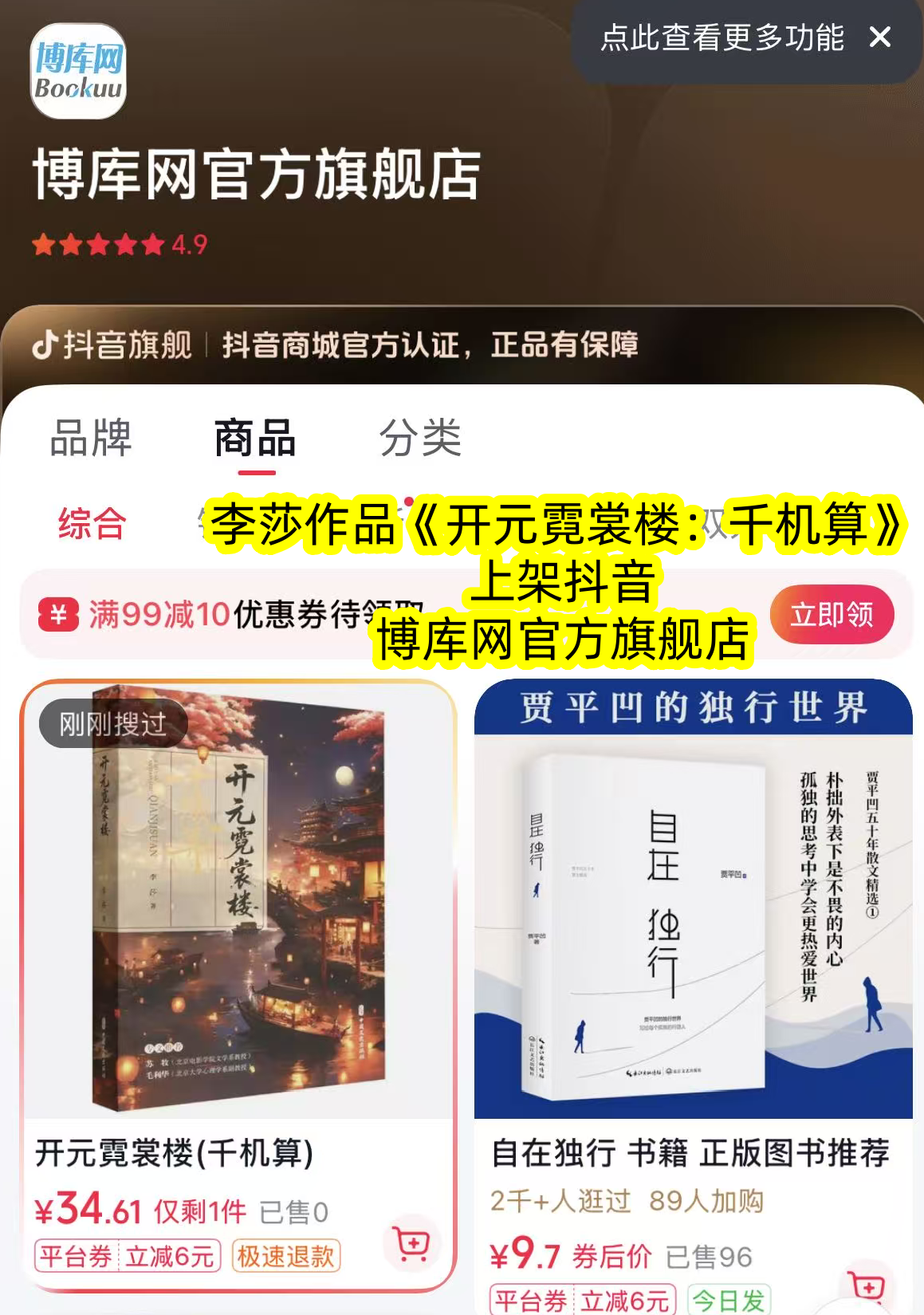 在文化消费持续升温的当下,《开元霓裳楼:千机算》抖音商品上架,为文史类书籍传播与销售提供了新范本。李莎以优质内容为核心,依托抖音电商优势,构建“内容展示+便捷购买”的闭环,既让文史好书突破圈层传播,也契合抖音用户的文化消费需求,推动文史类书籍走进更多大众视野,助力抖音文化消费生态升级。