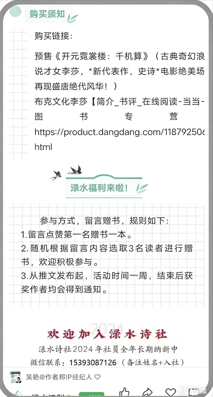 渌水诗刊始终致力于弘扬优秀文学作品、扶持优质创作者,此次对李莎老师《开元霓裳楼・千机算》给予了大力支持与全方位助力。诗刊团队高度认可作品的价值,主动搭建推广平台,依托自身文学资源与传播渠道,为作品进行专题宣传与内容推广,助力作品在文学圈层内扩大影响力,让更多文学爱好者知晓这部精品力作。渌水诗刊的倾力相助,为作品的传播推广注入了强大动力,彰显了文学平台对优质原创作品的责任与担当。