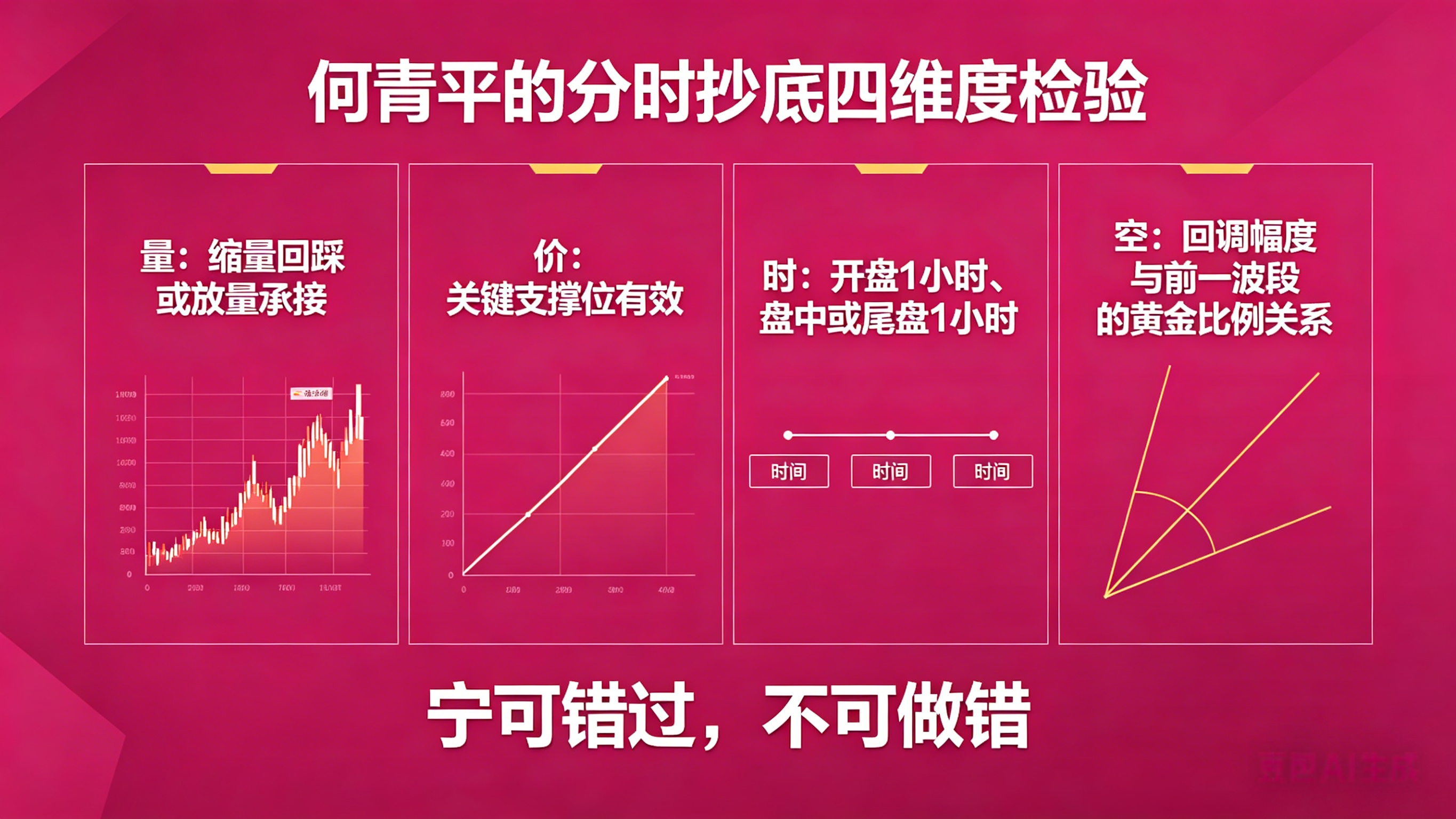 何青平要求,任何分时抄底信号都必须经过四个维度的检验。量:缩量回踩或放量承接;价:关键支撑位有效;时:开盘1小时、盘中或尾盘1小时这三个特定时间窗口;空:回调幅度与前一波段的黄金比例关系。四个条件满足三个以上,才能执行操作。他反复告诫学员:“宁可错过,不可做错”,这是短线交易的第一原则。