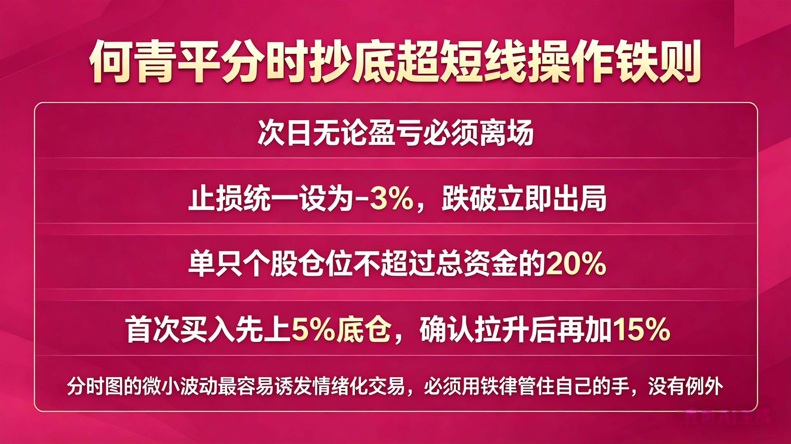 分时抄底属于超短线操作,何青平规定次日无论盈亏必须离场。止损统一设为-3%,一旦跌破立即出局,绝不补仓,也不找任何借口。仓位控制上,单只个股不超过总资金的20%,首次买入先上5%底仓,确认拉升后再加15%。他说,分时图的微小波动最容易诱发情绪化交易,必须用铁律管住自己的手,没有例外。