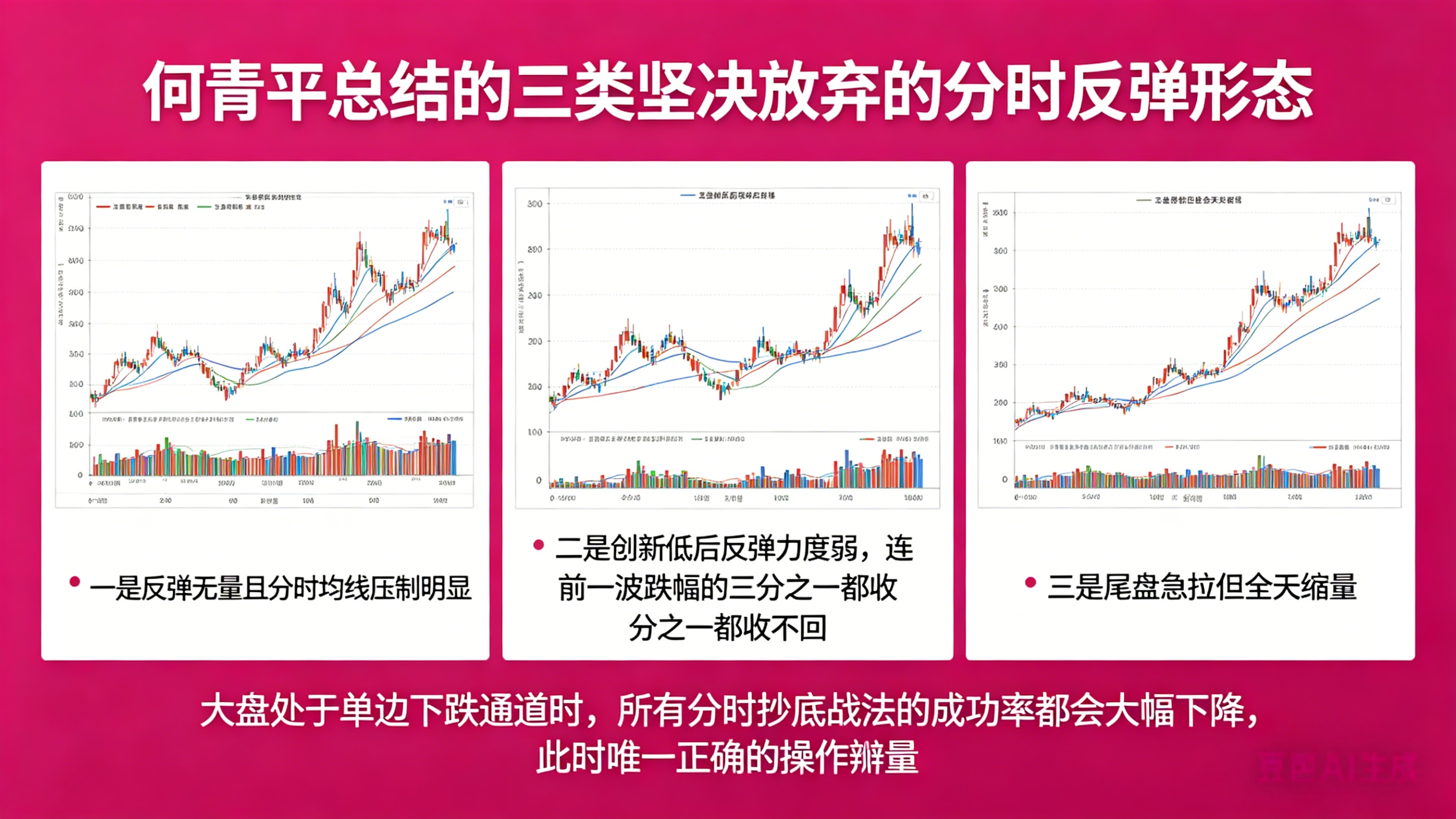 不是所有分时反弹都能抄底。何青平总结了三类坚决放弃的形态:一是反弹无量且分时均线压制明显;二是创新低后反弹力度弱,连前一波跌幅的三分之一都收不回;三是尾盘急拉但全天缩量,这属于主力做图诱多。他特别提醒,大盘处于单边下跌通道时,所有分时抄底战法的成功率都会大幅下降,此时唯一正确的操作就是空仓观望。