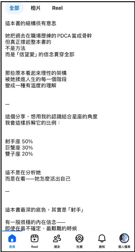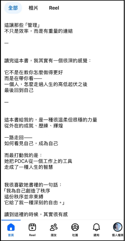 读完这本书,Amber Wu最深的感受是:它不教你如何做得更好,而是带你看见一个人如何穿越人生起伏,最终回归自我。它给予的,是一种温柔而沉稳的力量,引导我们从外在成就回归内心,学会看见自己、成为自己。最动人的,是她将PDCA从工作工具,活成人生智慧,那句“我为自己创造了秩序,这份秩序并非束缚,它给了我一种深刻的自由”,道尽了人生真谛。