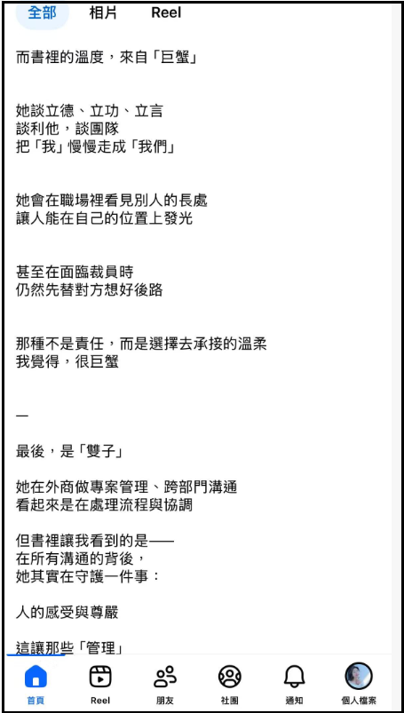 书里的温度,来自骨子里的温柔与善良。傅彗鑫谈立德立功立言,谈利他与团队,慢慢将“我”活成“我们”。她总能看见他人长处,让每个人在自己的位置上发光;即便面临裁员困境,也先替对方想好后路,用温柔守护他人。这份发自内心的善意,是最动人的特质,也让这本书充满治愈力量,让人明白职场不是战场,而是有温度的联结。