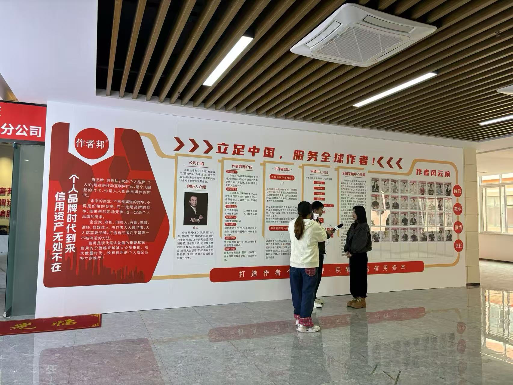 一面文化墙的诞生,远不止把文字和图片贴上去那么简单。在作者邦全国采编中心,这面墙从创意到定稿,经历了与设计师长达数周的反复沟通。设计师出了七版方案,每一版都在“信息密度”与“视觉冲击”之间寻找平衡。我们向设计师反复阐释作者邦的商业模式——从“采集、整理、上传、累计”的运作链条,到“个人信用资产”的核心价值主张。