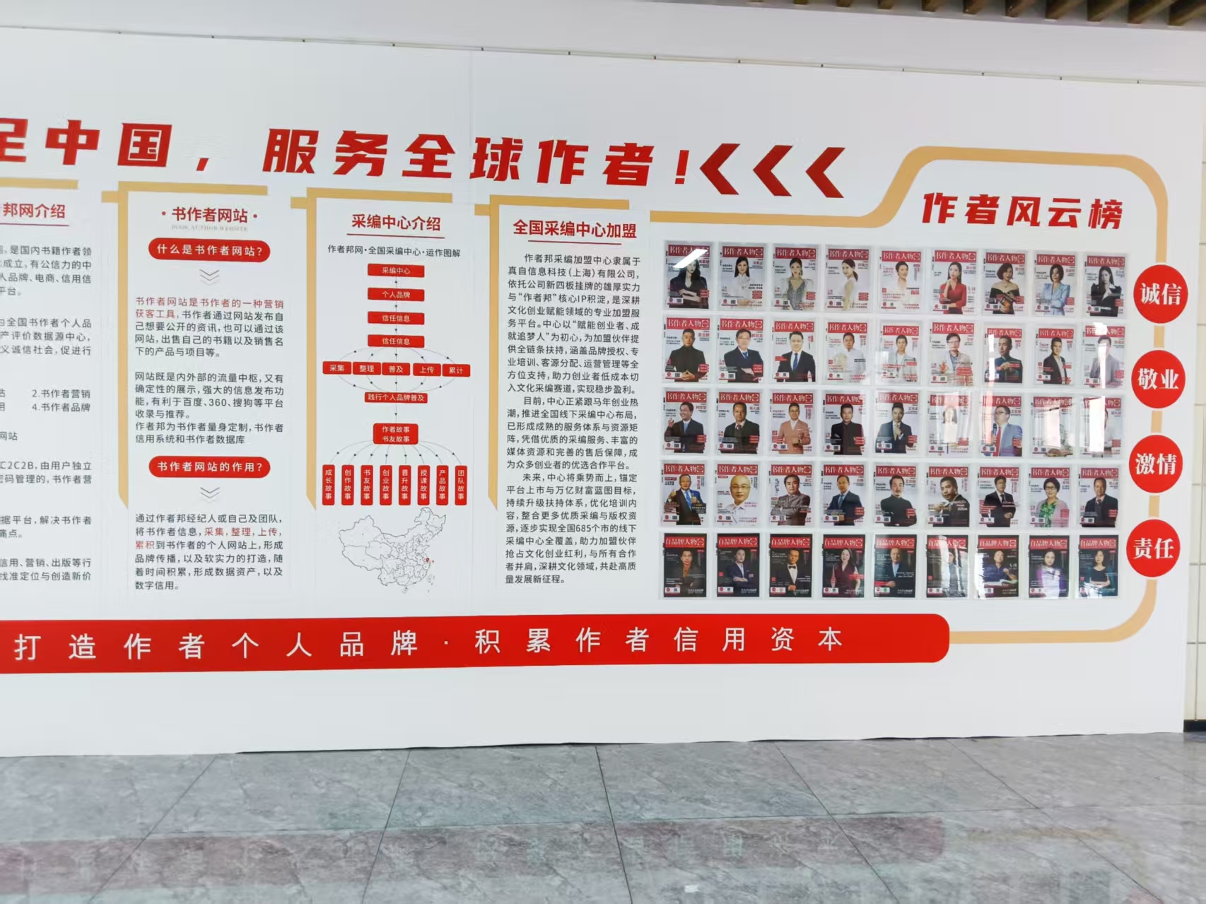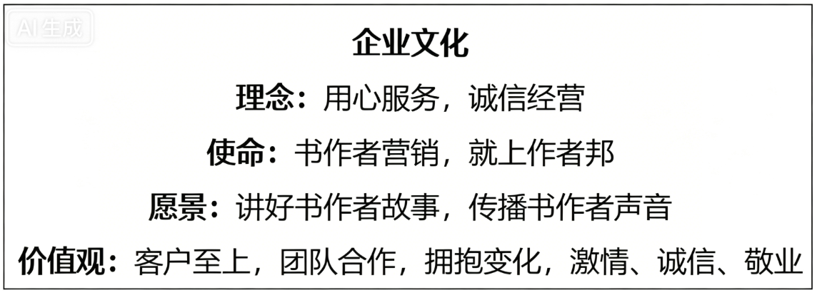 根据官网介绍,作者邦的企业文化清晰而坚定——理念是“用心服务,诚信经营”;使命是“书作者营销,就上作者邦”;愿景是“讲好书作者故事,传播书作者声音”;价值观包含客户至上、团队合作、拥抱变化、激情、诚信、敬业六个维度。这面文化墙的所有内容,都是从这片文化土壤中生长出来的。风云榜对应着“讲好书作者故事”的愿景,诚信与敬业对应着“用心服务”的理念,运作图解则服务于“书作者营销”的使命。
