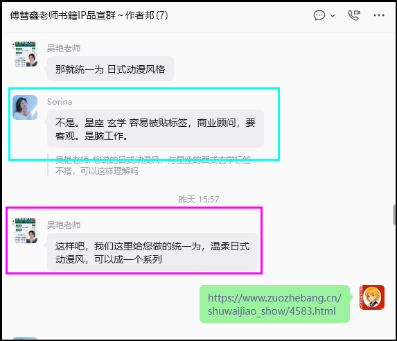 针对傅彗鑫老师的明确需求,吴艳老师快速调整创作方向,提出将内容统一为温柔日式动漫风,打造系列化、风格化的宣发内容矩阵。傅彗鑫老师认可该风格方向,同时再次强调必须彻底剔除玄学元素,确保内容主轴与商业顾问的专业身份高度契合,不出现任何偏差。
