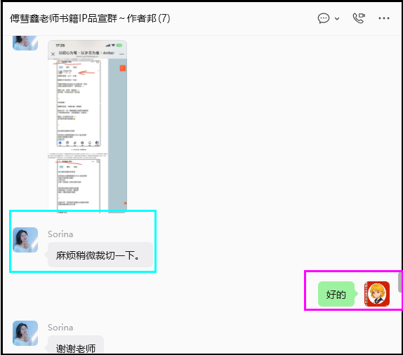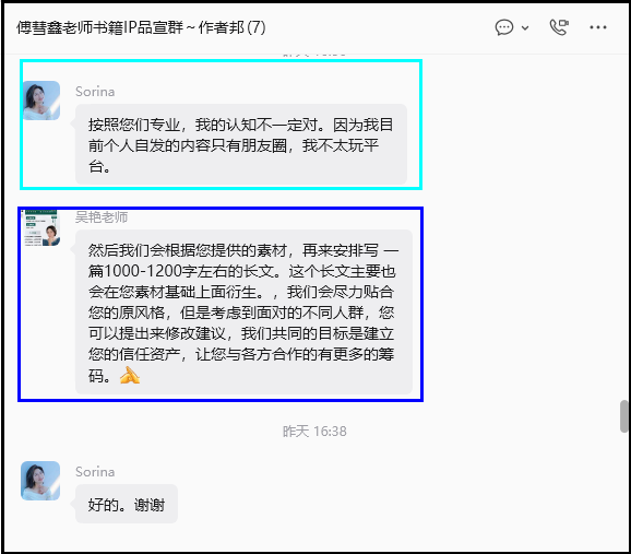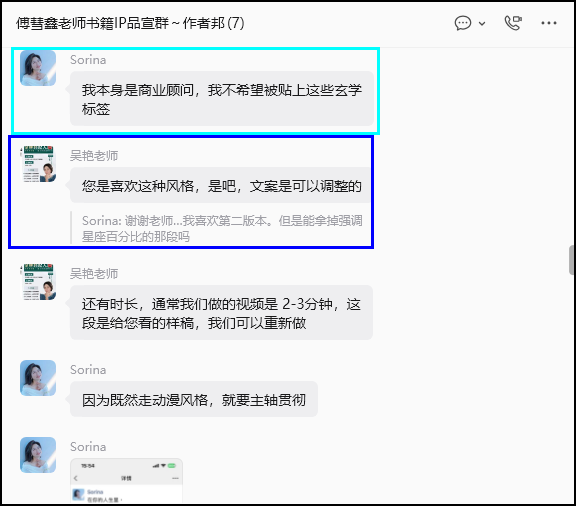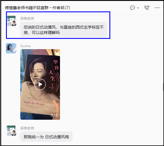 傅彗鑫老师的书籍IP宣发工作正式启动,团队在作者邦专属宣发群内开启了内容风格的初步探索。信任资产采编师明心月率先分享样稿视频,向傅彗鑫老师征询意见,询问当前呈现的风格是否符合预期,为后续全系列宣发内容锚定方向,开启了IP打造的第一步。