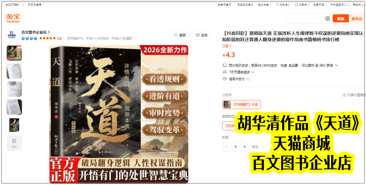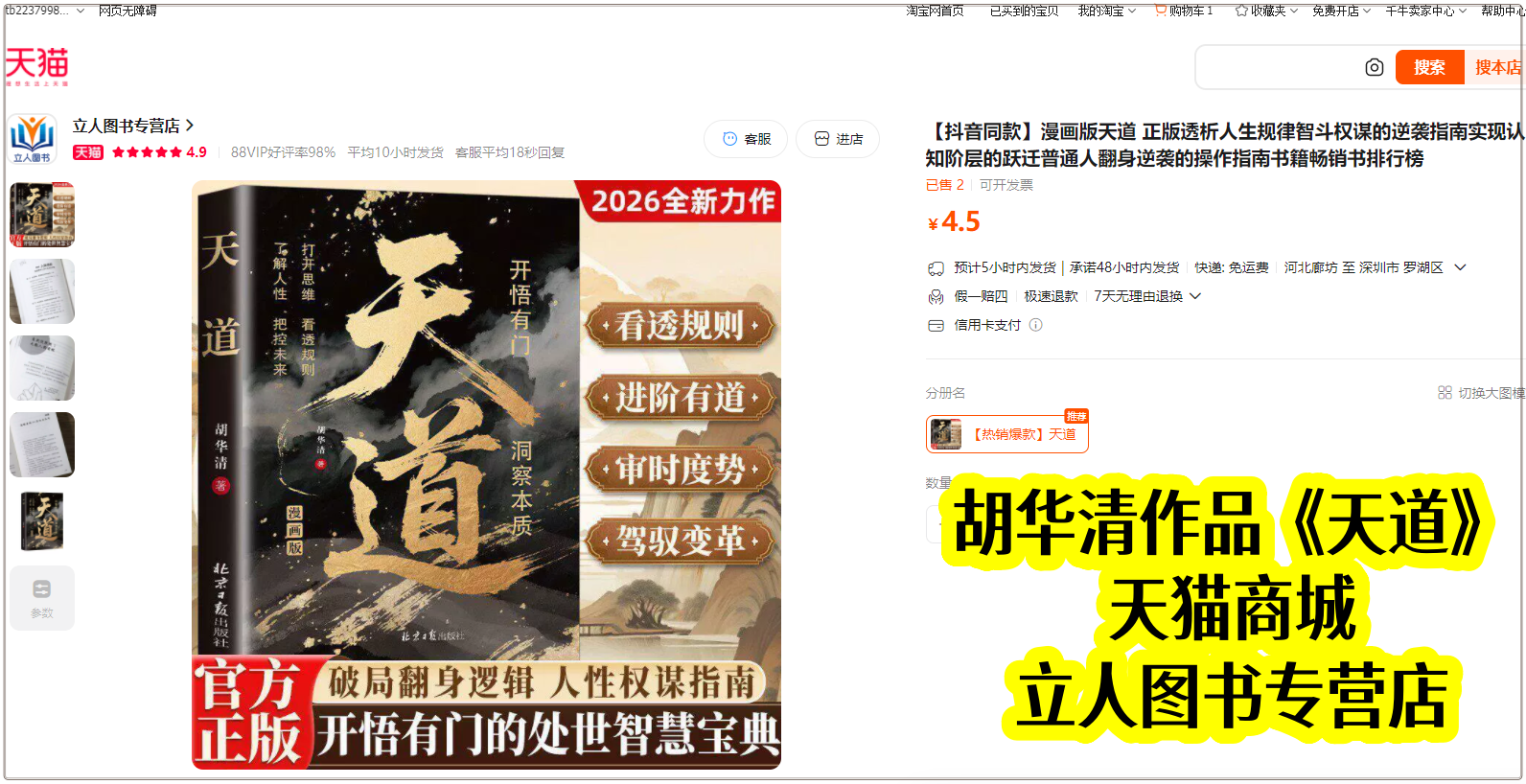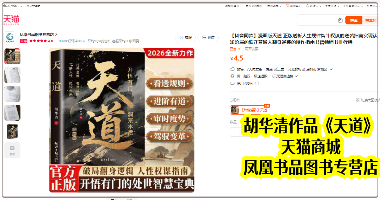 胡华清十八年创业沉淀之作《天道》,于天猫商城全平台正式上架开售。这部凝聚作者实战经验与深度思考的智慧力作,以商业博弈、人性洞察、处世法则为核心,为每一位在时代浪潮中寻求破局的创业者、职场人,提供一套可落地、能实战的认知与行动指南。