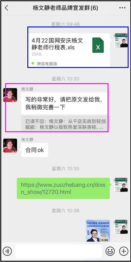 信任资产规划师苏畅老师率先在群内主动对接,向杨文静老师提出了定制化的个人新闻文章创作计划。苏畅老师表示,看到杨文静老师的卓越资质后,采编团队将为其打造专属个人宣传内容,不仅服务于本次书友活动,更将为其长期个人品牌宣传赋能。为了让杨文静老师更直观地了解创作标准,苏畅老师还分享了多篇同类型老师的自品牌人物文章作为参考,并主动索要更多个人素材,确保宣传内容精准匹配杨文静老师的专业形象与行业地位。