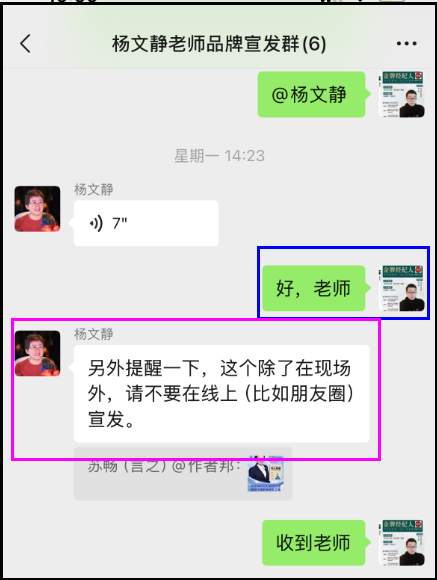 在合作推进过程中,杨文静老师基于自身行业经验与活动需求,明确提出了宣传规范要求:除现场宣传外,禁止在线上(如朋友圈)进行宣发。这一要求既保障了活动的专属感与现场体验,也体现了杨文静对品牌宣传节奏的精准把控。苏畅老师团队第一时间响应,明确表示“收到老师”,严格遵循杨文静老师的要求执行宣传计划,展现出高度的执行力与对合作方需求的尊重。