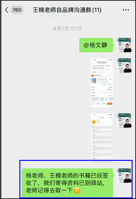 除品牌宣发群外,苏畅老师还在王楠老师自品牌沟通群中,同步为杨文静老师提供延伸服务。当王楠老师的书籍签收后,苏畅老师第一时间在群内提醒杨文静取件,将服务延伸至细节之处,让杨文静老师感受到全方位的贴心支持。这种跨群协同的服务模式,不仅体现了苏畅老师团队的高效协作能力,更彰显了信任资产规划师以客户为中心的服务理念,让杨文静老师的品牌打造过程全程无忧。