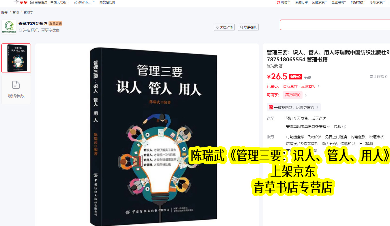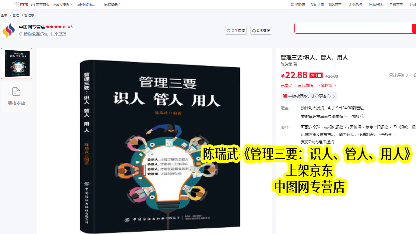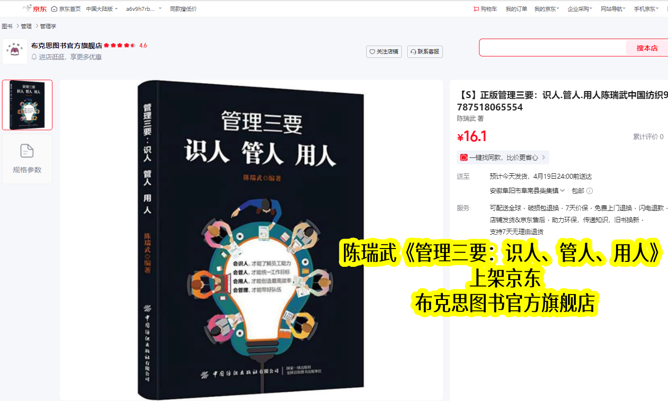 陈瑞武深耕管理领域数十年,不仅是资深管理学者,更是实战型企业家,结合自身丰富的企业经营实战经验与理论积淀,打磨出《管理三要:识人、管人、用人》这部经典之作。该书于2019年11月正式出版,同步上架京东平台,截至2026年4月,已在京东稳定上架约6年半,成为无数管理者的必备实操指南,始终聚焦“识人、管人、用人”三大核心,助力管理者破解团队管理困境。