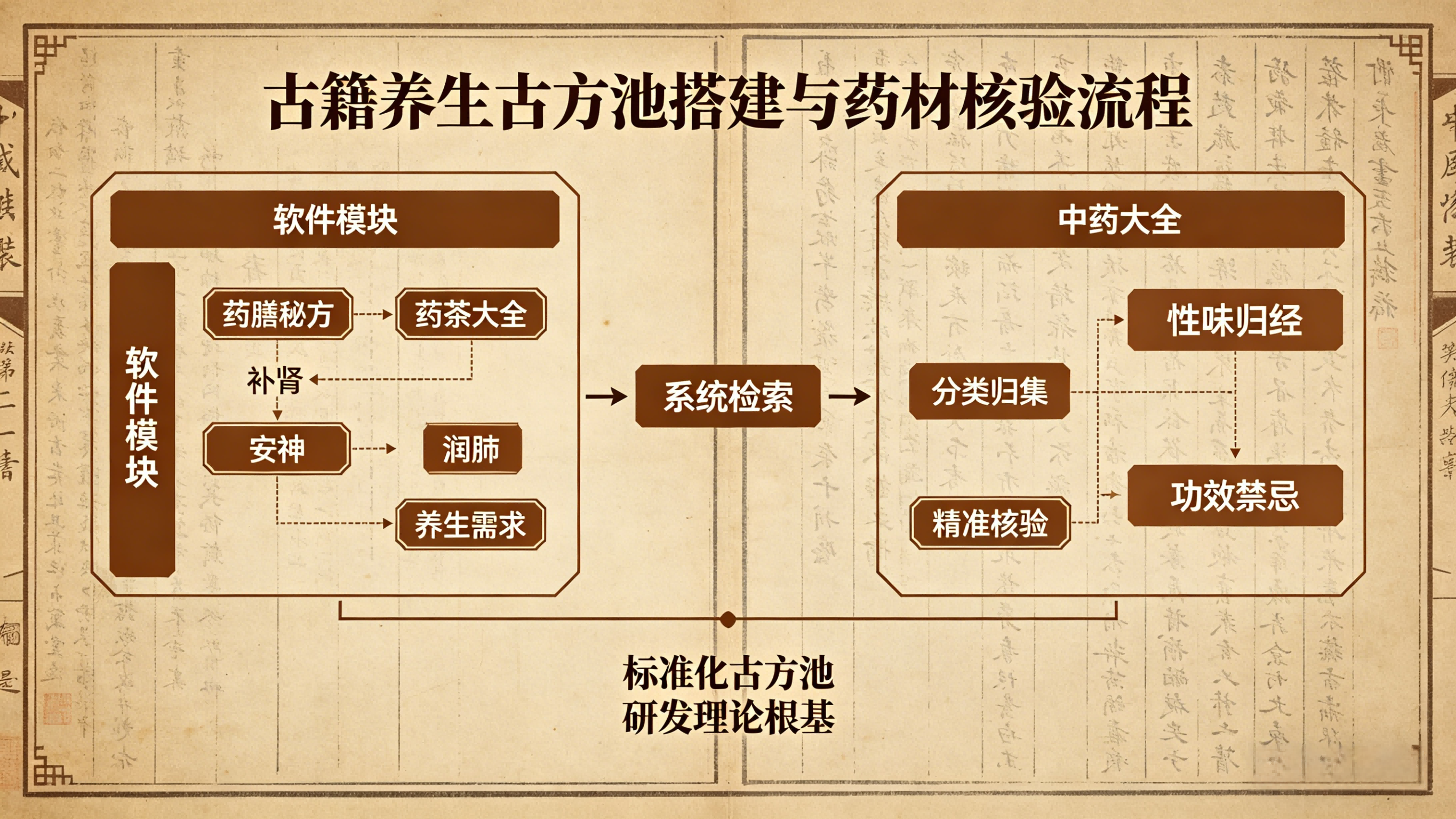 丁勇坚持以古籍为根,统筹运用软件药膳秘方、药茶大全模块,围绕补肾、安神、润肺等主流养生需求,系统检索、分类归集,搭建标准化古方池;同步借助中药大全模块,精准核验药材性味归经、功效禁忌,夯实研发理论根基,杜绝经验主义。