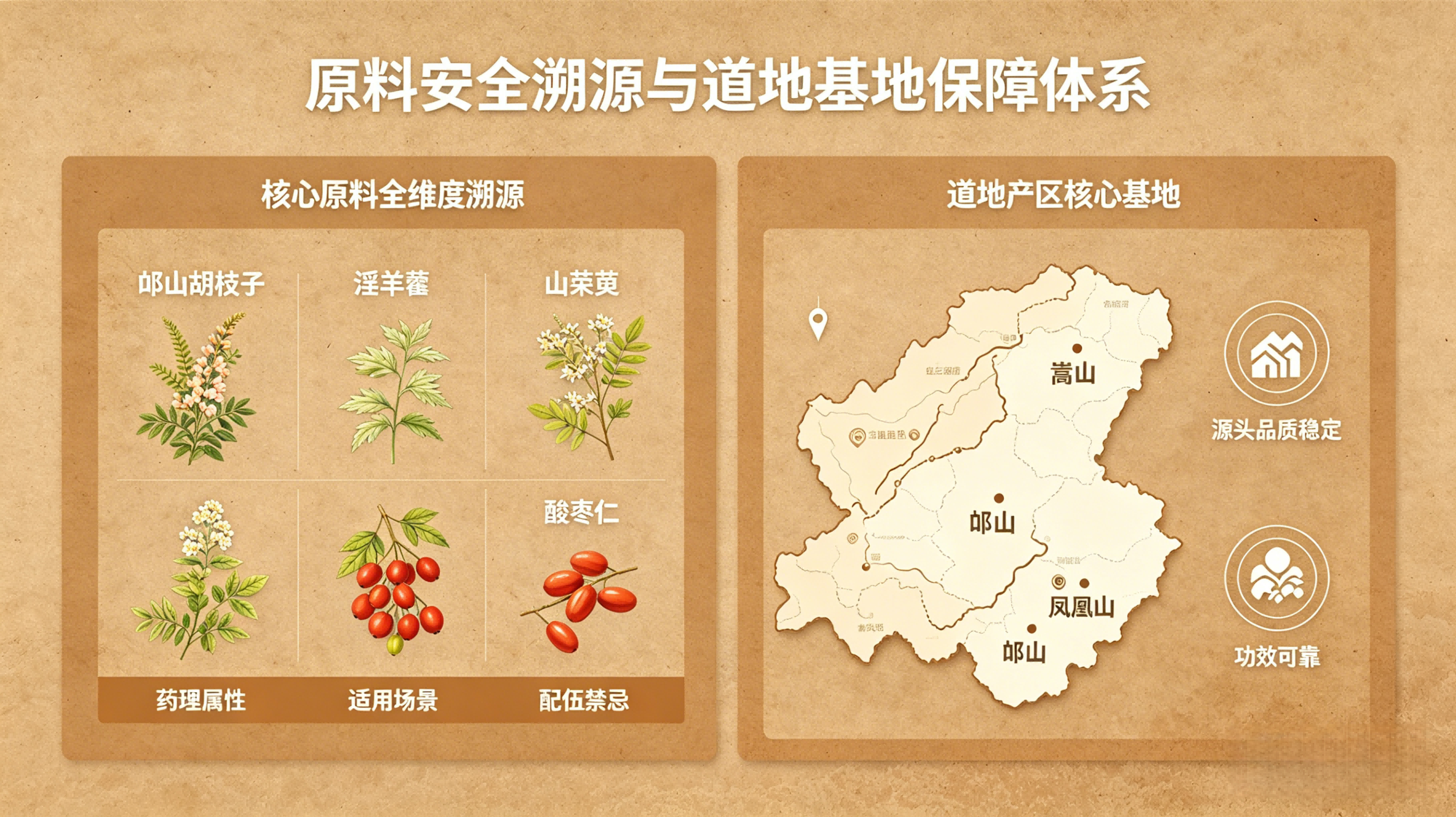 以丁勇提出的原料安全第一原则,对邙山胡枝子、淫羊藿、山茱萸、酸枣仁等核心原料开展全维度溯源,明确药理属性、适用场景与配伍禁忌;结合道地产区优势,锁定嵩山、凤凰山、邙山等核心基地,从源头保障原料品质稳定、功效可靠。