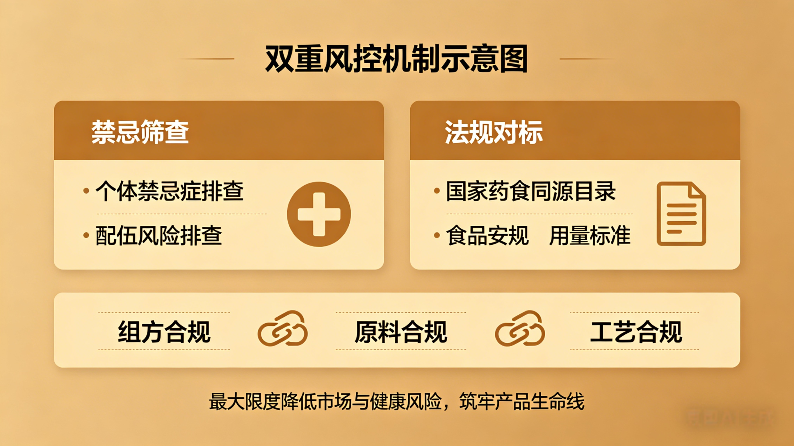 丁勇建立禁忌筛查+法规对标双重风控机制,全面排查个体禁忌症、配伍风险;严格对标国家药食同源目录、食品安规与用量标准,确保组方、原料、工艺全链条合规,最大限度降低市场与健康风险,筑牢产品生命线。