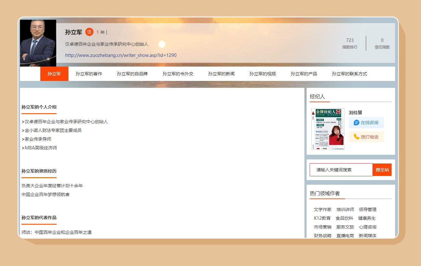 孙立军老师入驻作者邦网,实现了专业力量与平台资源的双向赋能。一方面,作者邦网为孙立军老师提供权威展示窗口、专业运营支持、全网传播渠道,解决个人品牌打造过程中的内容创作、推广运营、信任沉淀等难题,让专业价值高效传递;另一方面,孙立军老师的入驻丰富了作者邦网在家业传承、企业经营领域的内容生态,为平台用户提供更具深度、更具实战性的专业内容,推动平台向更专业、更多元的方向发展,共同构建个人品牌赋能与行业价值传播的良性生态。