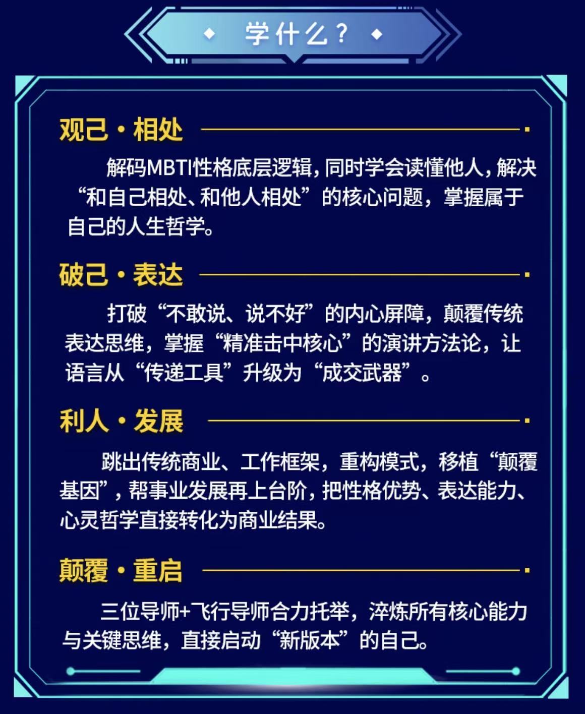 蒋佳琦作为MBTI国际认证施测师、《反本能思维》作者,将带来性格与表达的深度赋能。他深耕性格心理学与表达领域多年,擅长通过MBTI性格解码,帮助学员精准认知自我、读懂他人,打破性格局限;同时结合《反本能思维》中的核心理念,引导学员突破表达惯性,掌握高效沟通技巧,破解人际相处与表达输出中的核心难题,让每一位学员都能实现性格与表达的双重提升。