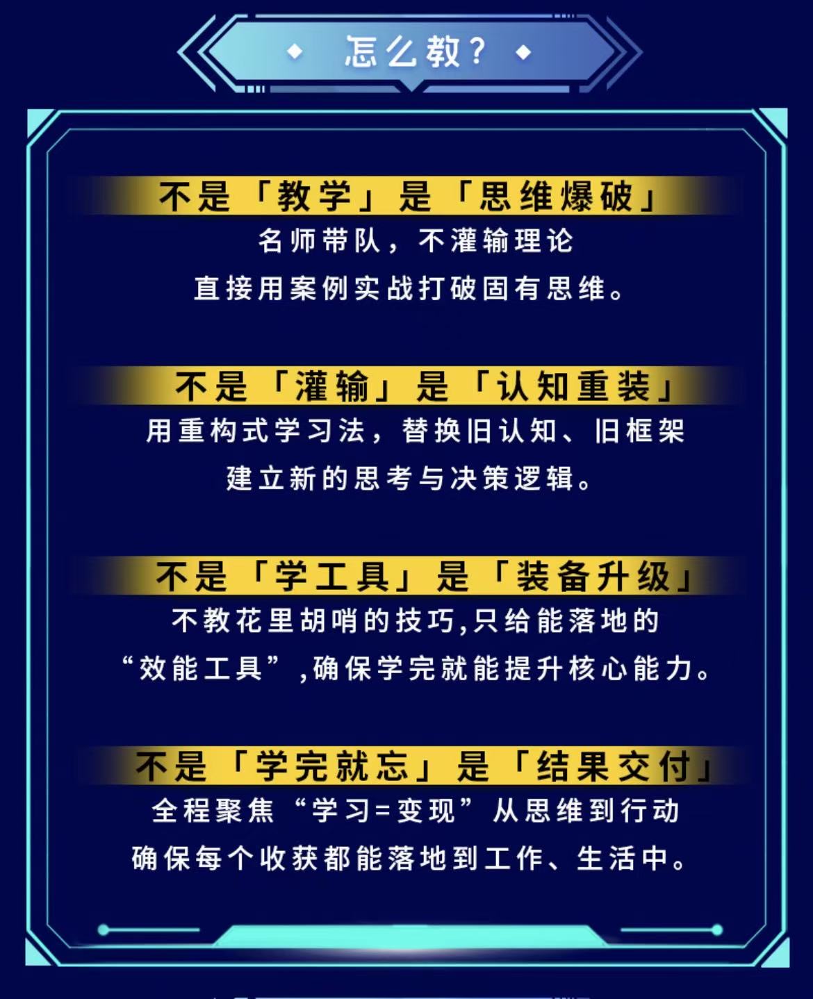 姜立鹏老师的教学理念,始终围绕“利他”与“落地”展开。他坚信“人是环境的产物”,主张正心、正念、正语、正行,在课程中既注重技巧传授,更重视学员心态与信念的培养。他始终强调“学习=变现”,拒绝空洞理论,所有课程内容均源自自身实战经验,确保学员能将所学快速转化为工作成果,实现能力与收益的双重提升。