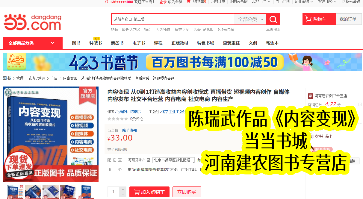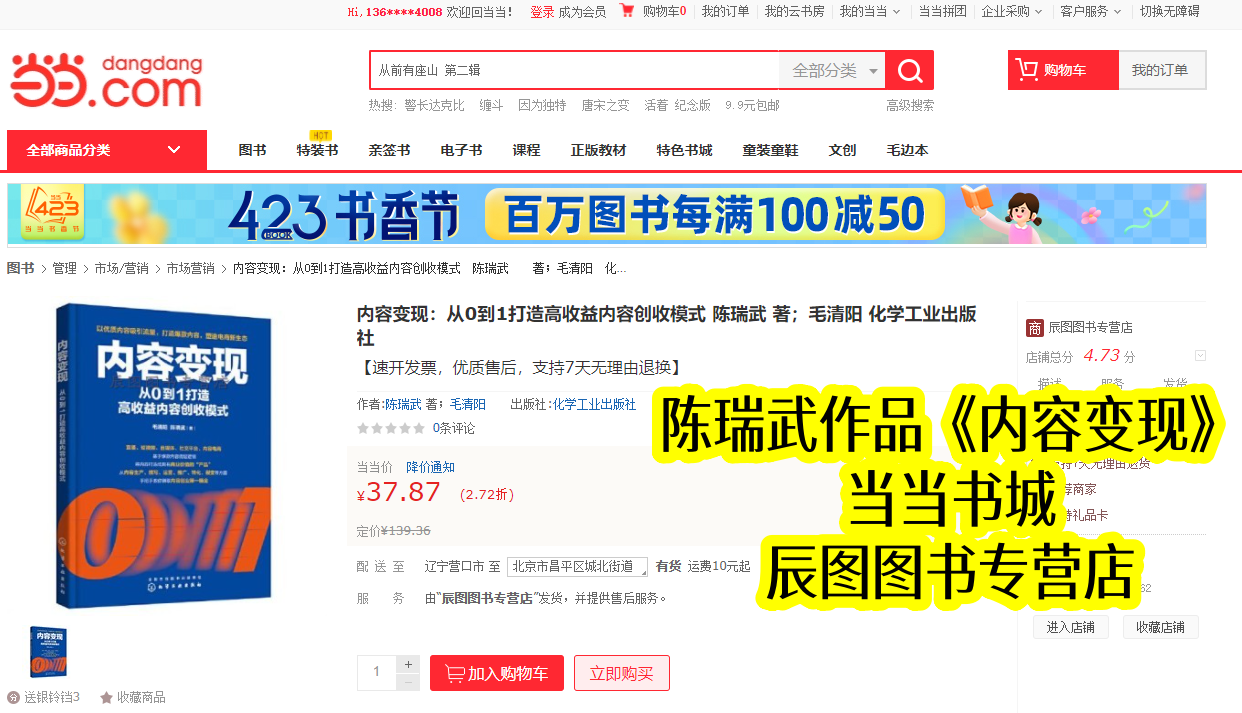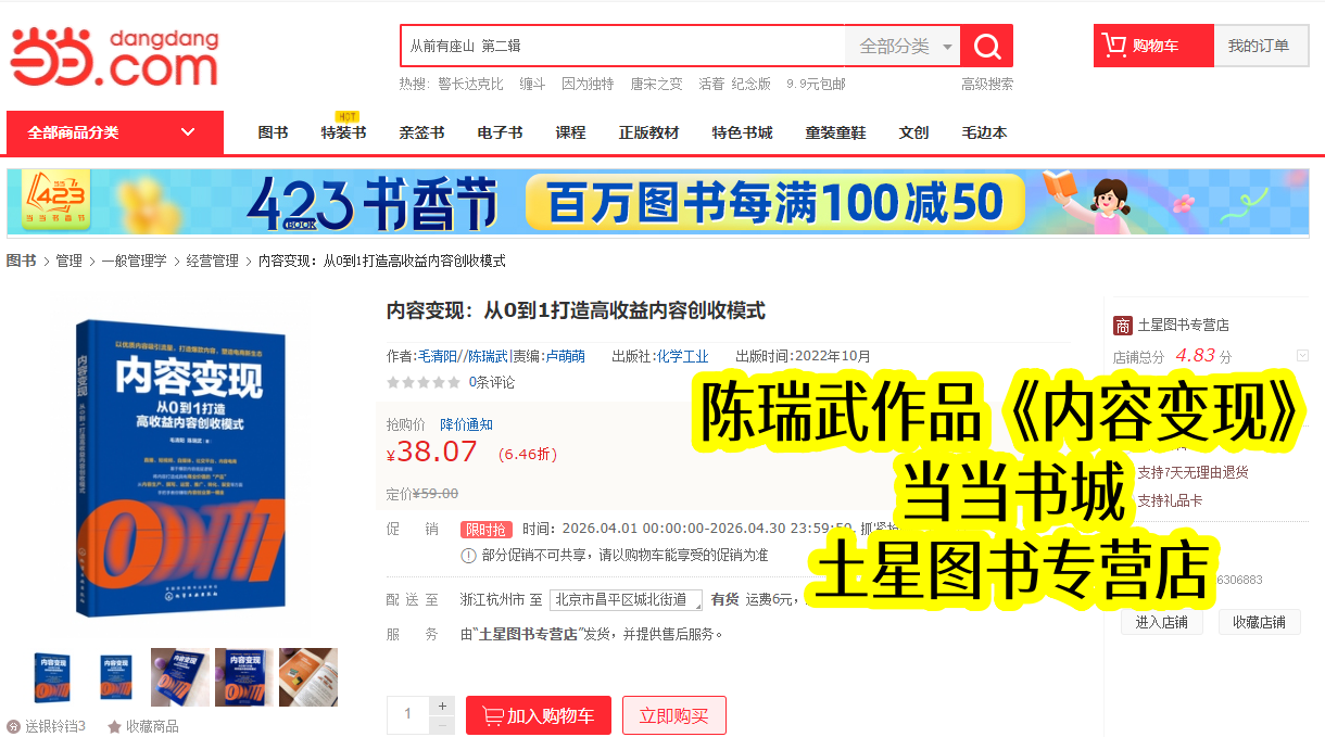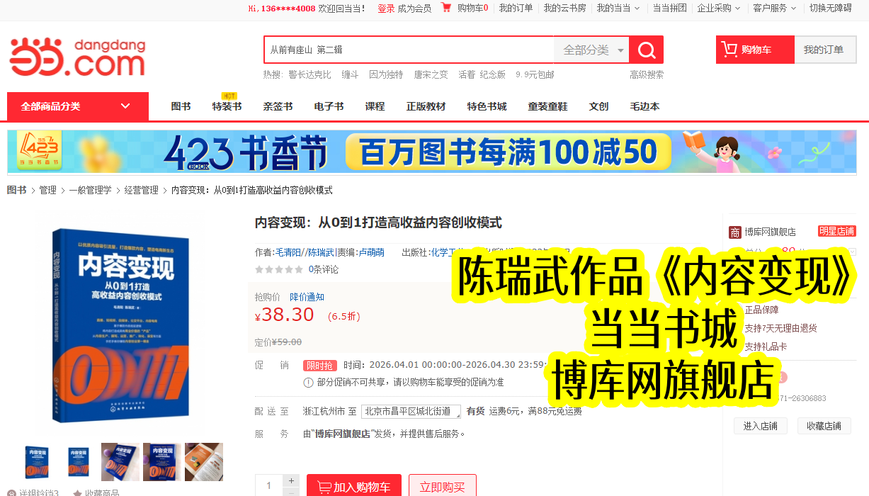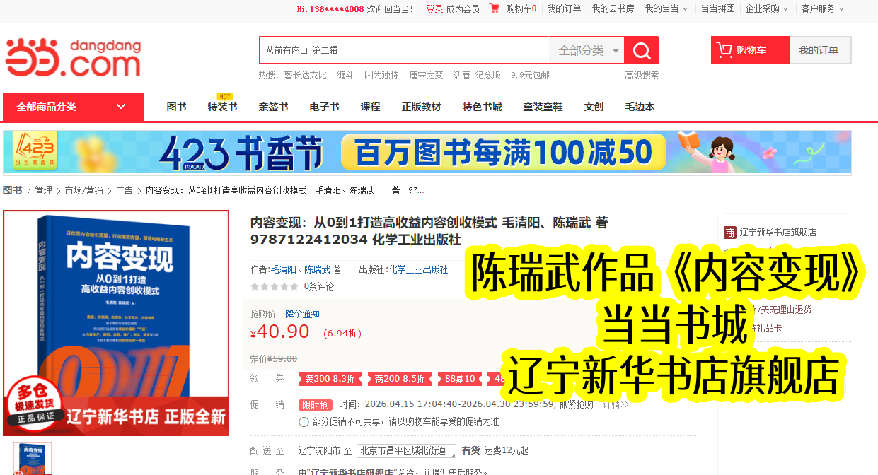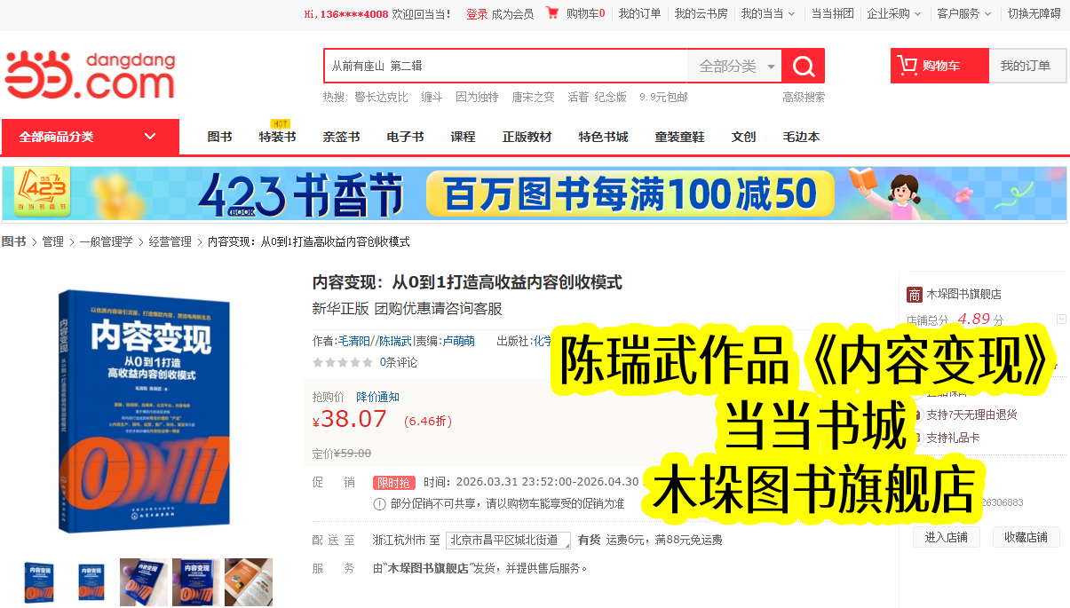 当当书城作为国内知名图书平台,是优质专业书籍传播的重要载体。陈瑞武主导合著的《内容变现》,2022年10月与出版同步上架,凭借清晰定位和陈瑞武的实战总结,很快在同类书籍中脱颖而出。上架初期便收获创作者青睐,销量稳步攀升,成为当当内容运营类热门书籍,也让陈瑞武的变现理念得到广泛传播。