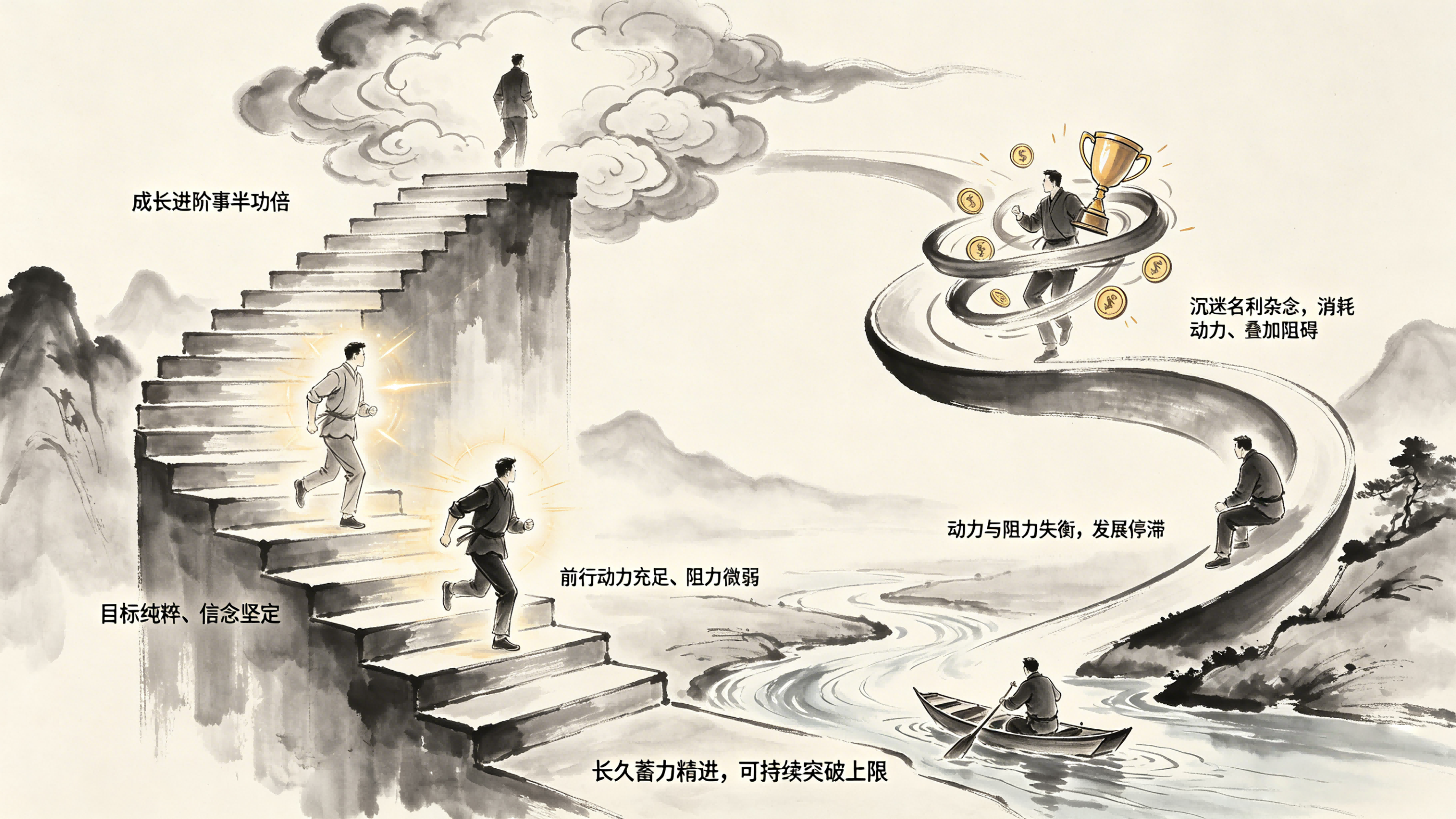 结合多年实战沉淀,短线教练何青平提出,人生进阶与成长发展,完全契合加速度运行逻辑。目标纯粹、信念坚定,前行动力充足、阻力微弱,成长进阶便会事半功倍;沉迷名利杂念,只会消耗动力、叠加阻碍。动力与阻力一旦失衡,发展便会停滞,长久蓄力精进,方可持续突破上限。