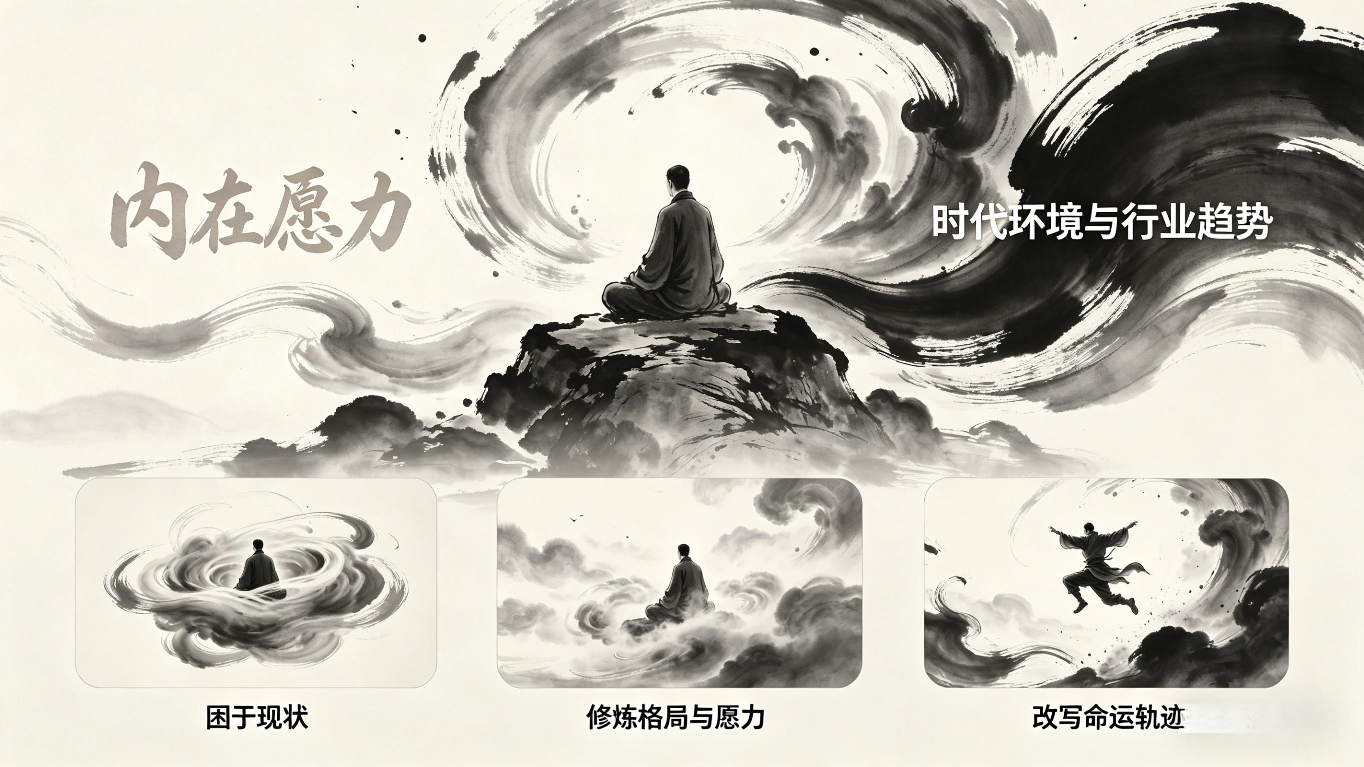 短线教练何青平以牛顿惯性定律解读人生与事业,将内在愿力视作核心内力,时代环境与行业趋势定义为关键外力。缺少双重力量加持,人便会困于固有现状难以突破。唯有修炼远大格局与坚定愿力,激活内生动力,主动打破思维惯性,才能突破局限,改写自身命运轨迹。