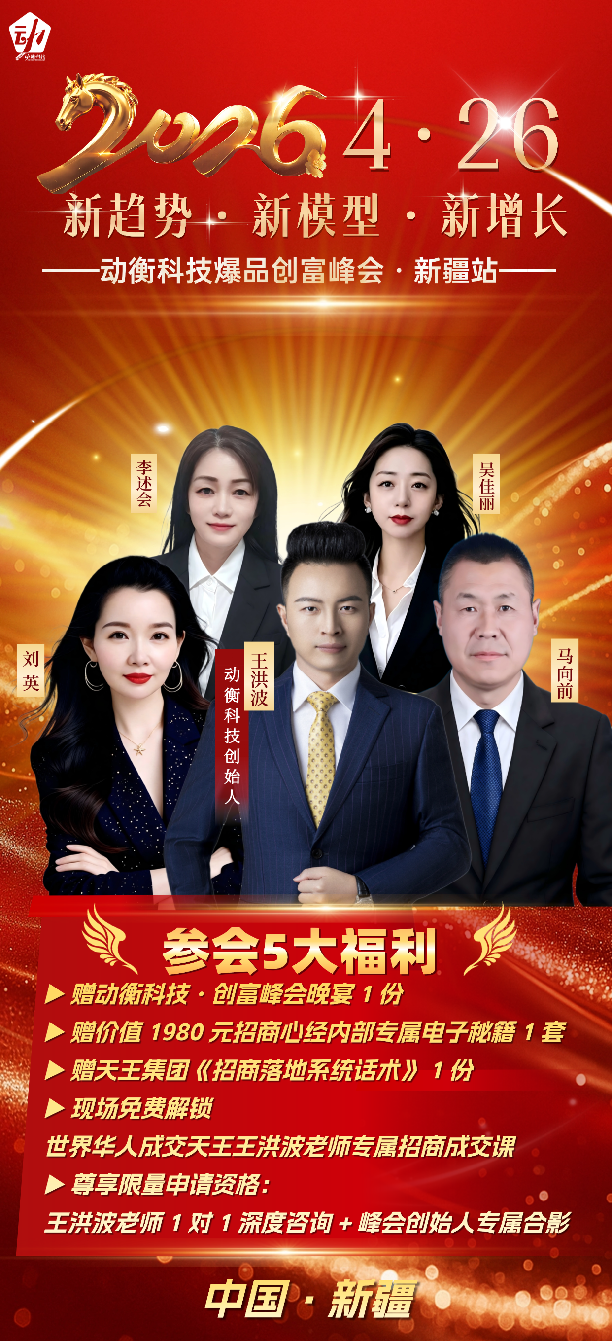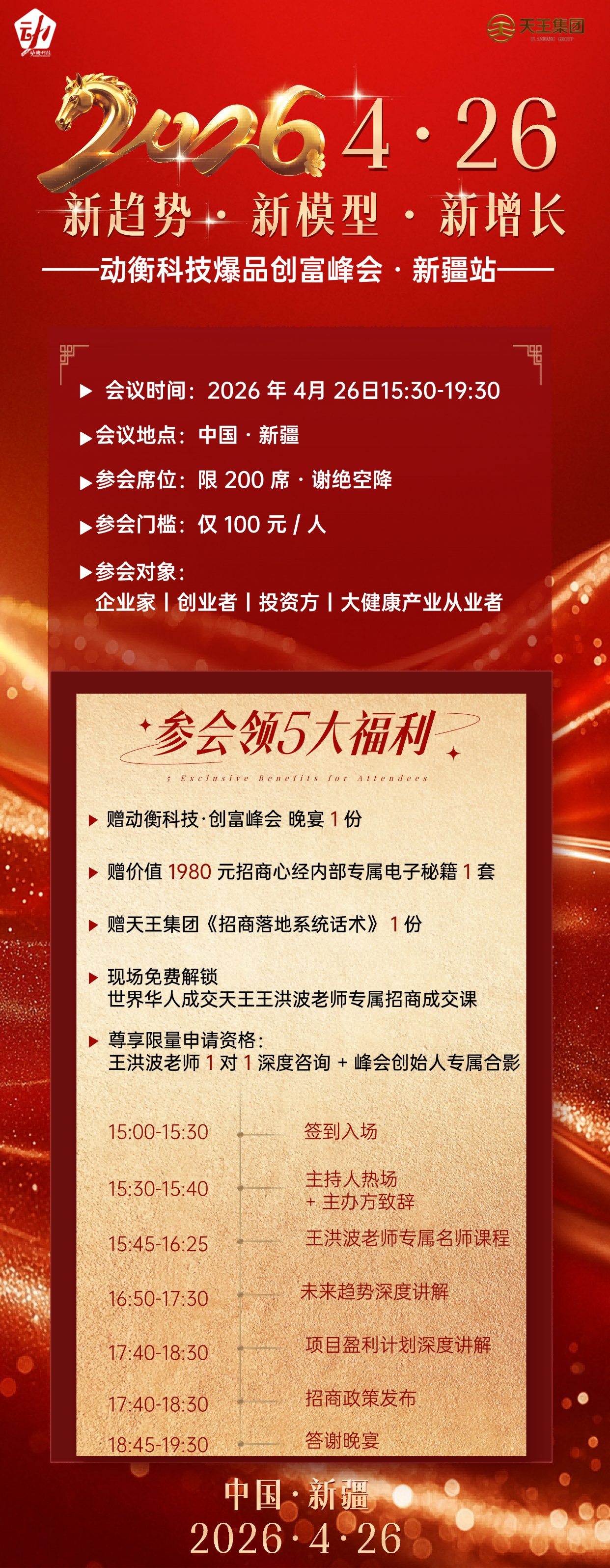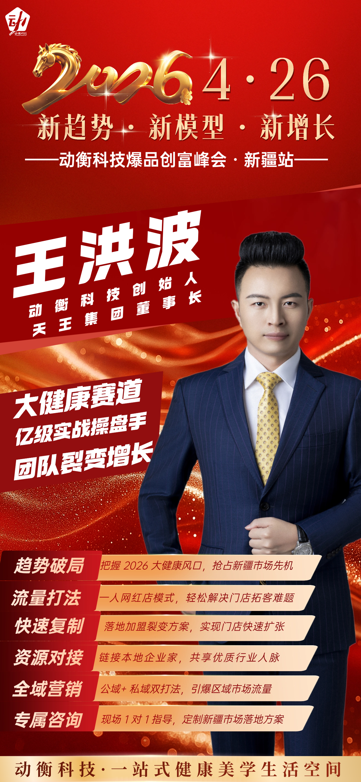 2026 年 4 月 26 日,天王集团旗下动衡科技爆品创富峰会新疆站正式开启预约。本次峰会以 “新趋势・新模式・新增长” 为主题,聚焦大健康产业核心赛道,重点推出动衡轻影特殊营养膳食补充剂,为新疆本地创业者、门店经营者搭建高价值交流与合作平台,王洪波老师将携亿级实战操盘经验亲临现场,解锁产品与市场双维度增长密码。
