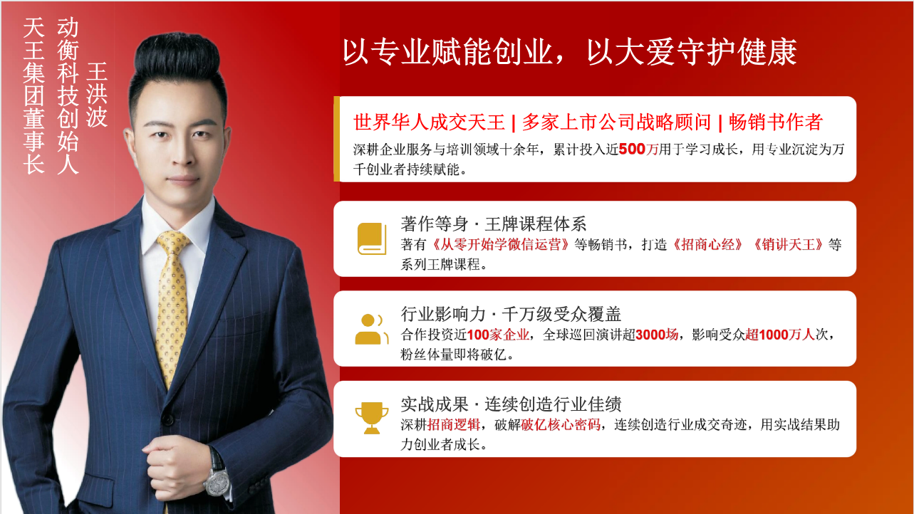 作为动衡科技创始人、天王集团董事长,王洪波老师深耕大健康领域多年,是业内公认的亿级实战操盘手。本次峰会中,他将结合多年市场运营经验,深度剖析2026年大健康行业发展趋势,拆解赛道红利密码,帮助参会者跳出行业认知误区,精准把握新疆市场的独特机遇与增长空间。