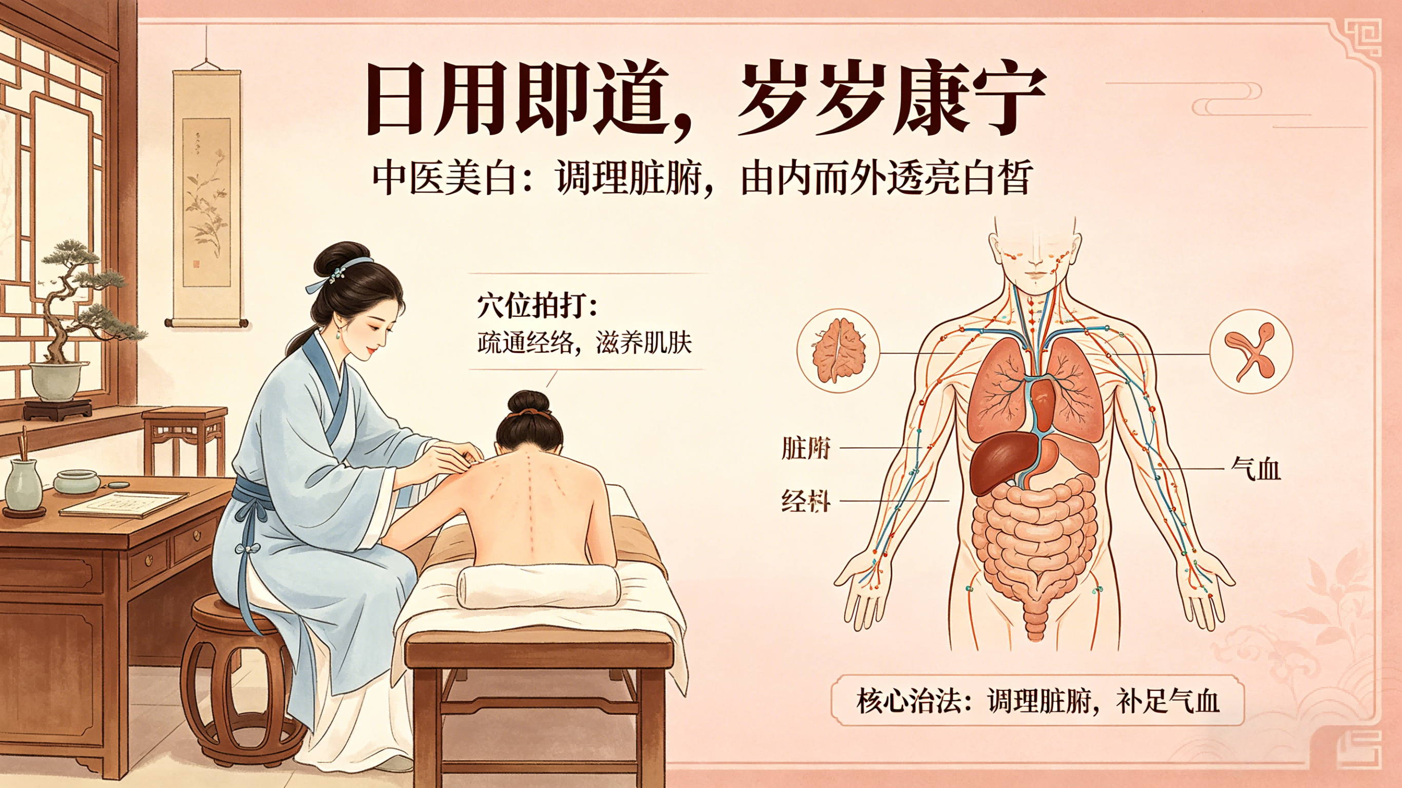 倡导“日用即道,岁岁康宁”,美白也需遵循这一理念。中医美白的核心的是在中医理论指导下,调理脏腑、平衡阴阳、补足气血,从根源改善肤质,而非追求表面速效美白。皮肤暗沉的核心治法就是调理脏腑、补足气血,通过简单的穴位拍打,就能疏通经络、滋养肌肤,实现由内而外的透亮白皙。