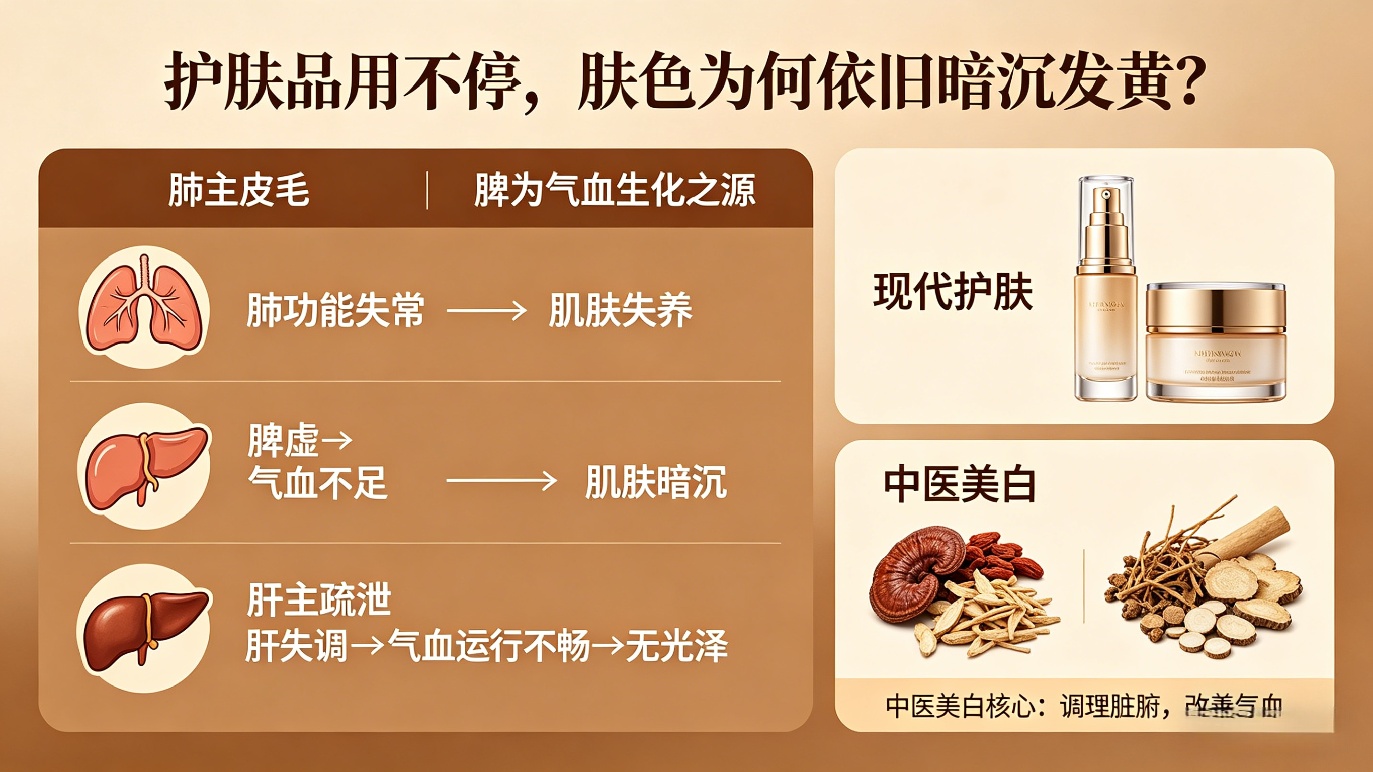 很多人疑惑,为何护肤品用不停,肤色依旧暗沉发黄?结合中医理论的实操经验,我告诉大家:除了天生肤色,后天暗沉多与脏腑失调、气血不足有关。肺主皮毛、脾为气血生化之源、肝主疏泄,任一脏腑功能失常,都会导致气血运行不畅,肌肤失养,进而出现暗沉、无光泽,这也是中医美白区别于现代护肤的核心所在。
