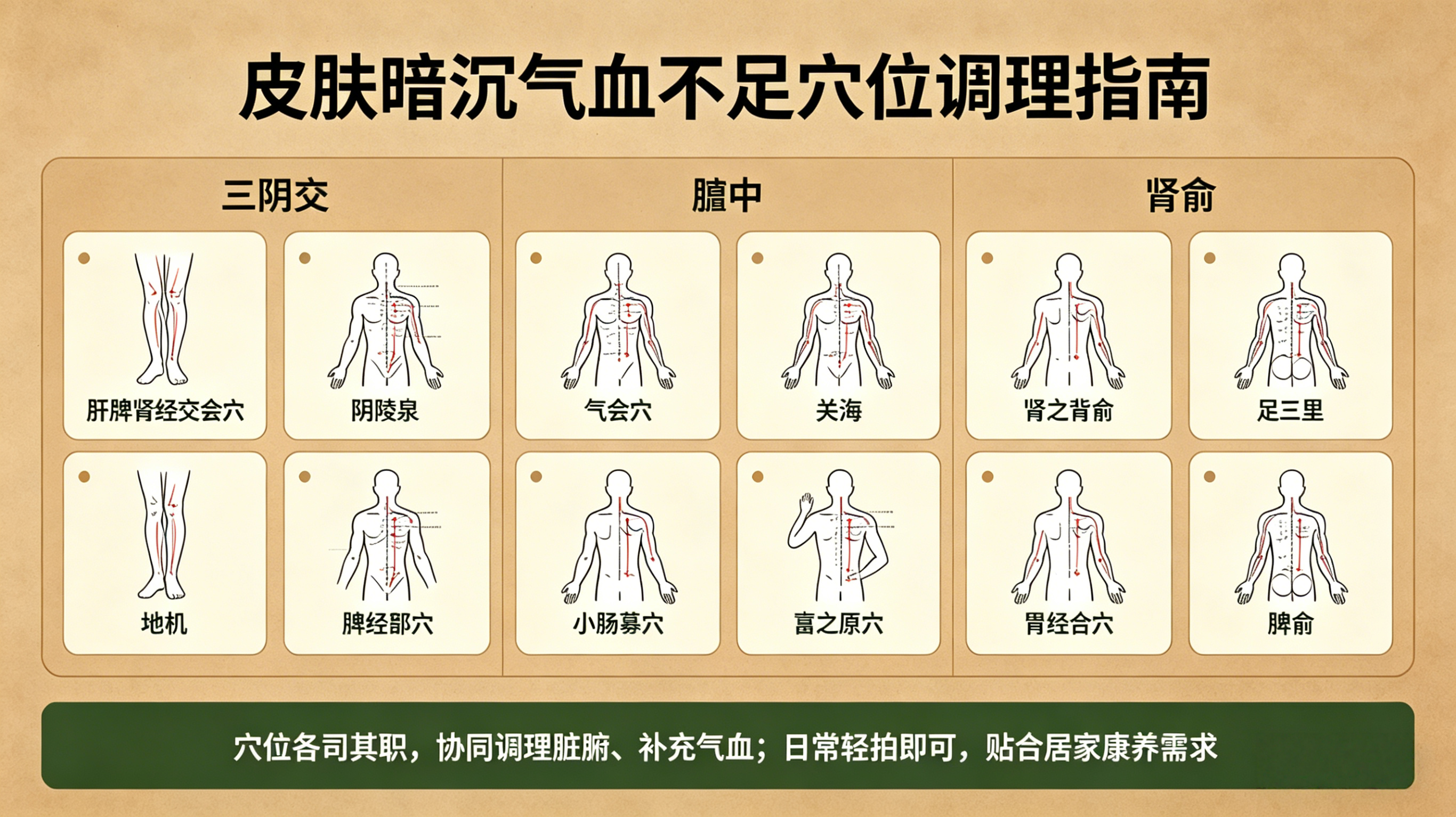 穴位调理经验,针对皮肤暗沉、气血不足的问题,我精选了9个核心穴位,分别是三阴交、阴陵泉、地机、膻中、关元、气海、肾俞、足三里、脾俞。这9个穴位各司其职、协同发力,涵盖脏腑调理、气血补充的关键节点,无需专业基础,日常轻拍就能发挥作用,贴合居家康养需求。