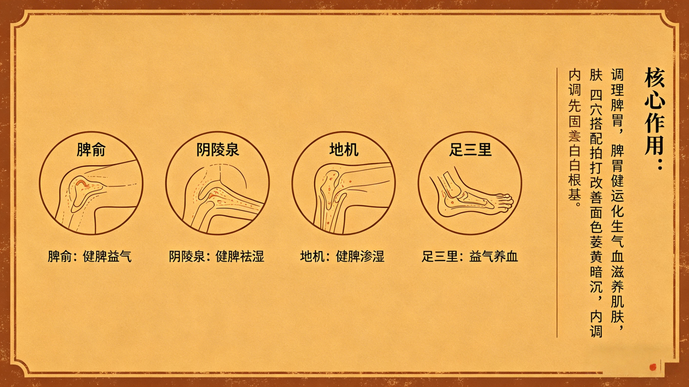 脾俞、阴陵泉、地机、足三里这四个穴位,核心作用是调理脾胃。脾为后天之本,脾胃健运才能化生充足气血,滋养肌肤。脾俞健脾益气,阴陵泉健脾祛湿,地机健脾渗湿,足三里益气养血,这四穴搭配拍打,能改善脾胃虚弱导致的面色萎黄、暗沉,从根源筑牢美白根基,“内调为先”的理念。
