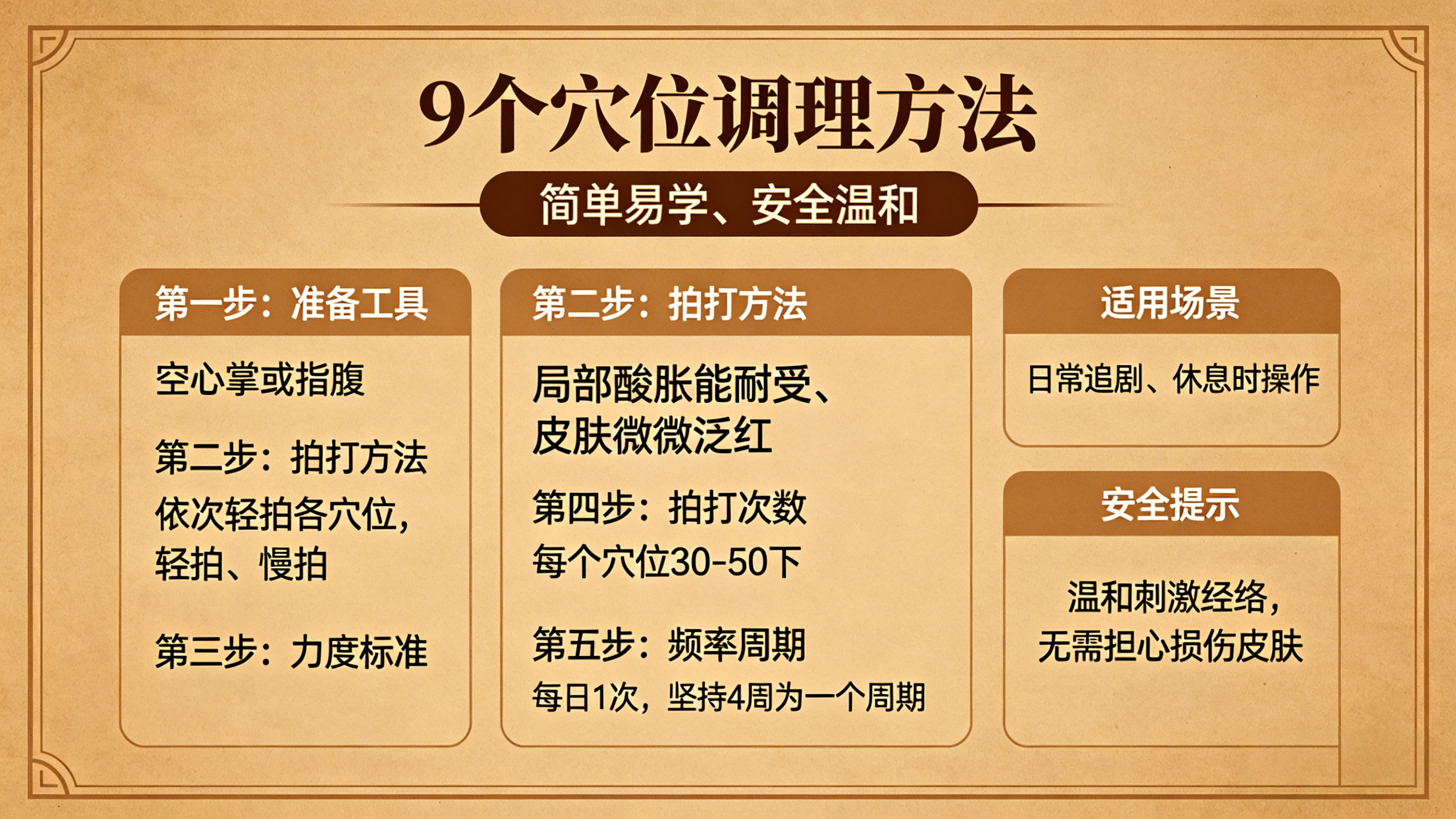 精髓就是“简单易学、安全温和”,这9个穴位的调理方法无需复杂工具,重点在于“轻拍、慢拍”。用空心掌或指腹,依次轻拍各穴位,力度以局部酸胀能耐受、皮肤微微泛红为宜,每个穴位拍打30-50下,每日1次,坚持4周为一个周期,温和刺激经络,无需担心损伤皮肤,日常追剧、休息时就能操作。