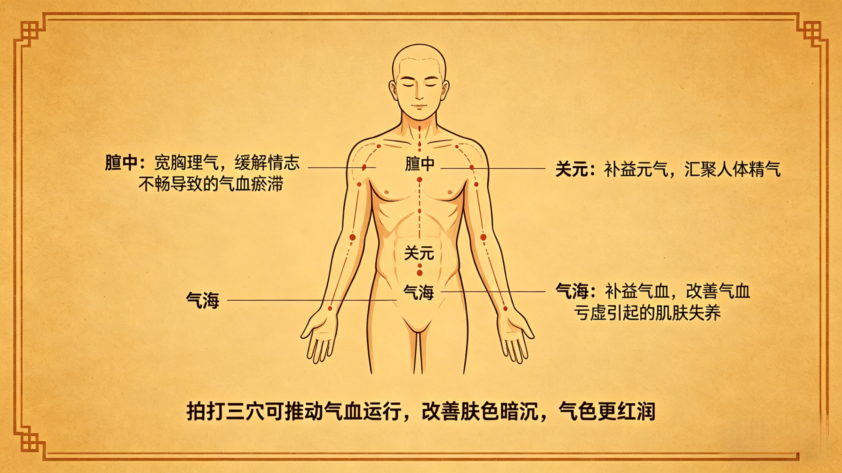 膻中、关元、气海三穴,是补充气血、调和脏腑的核心穴位。膻中宽胸理气,缓解情志不畅导致的气血瘀滞;关元补益元气,汇聚人体精气;气海补益气血,改善气血亏虚引起的肌肤失养。这三穴拍打,能推动气血运行,让养分直达肌肤,改善肤色暗沉,让气色更红润。