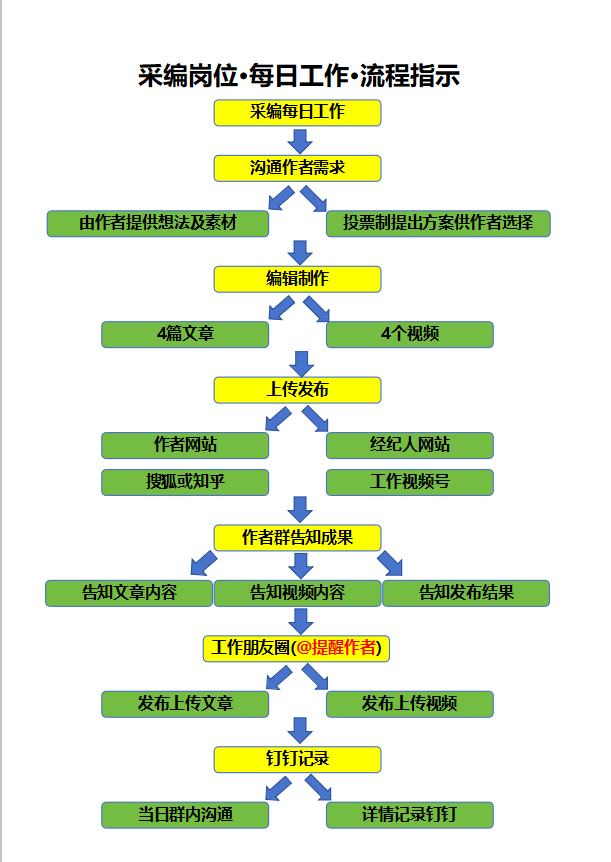 采编岗位的每日工作流程,相比兼职流程更具深度与持续性,以 “沟通作者需求 - 多形式内容制作 - 多平台发布 - 全渠道同步 - 记录归档” 为核心,需完成 4 篇文章、4 个视频的内容产出,同步至作者网站、经纪人网站、搜狐 / 知乎及工作视频号,再通过作者群、朋友圈同步成果并在钉钉归档记录。这套流程的好处在于,通过高频次、多形式的内容输出,为作者打造持续的品牌曝光,同时全流程记录确保服务可追溯、可优化。