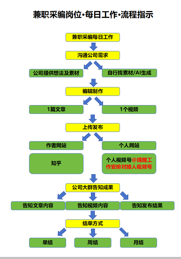 兼职采编岗位的每日工作流程,以 “沟通需求 - 内容制作 - 发布同步 - 结算闭环” 为核心逻辑,形成清晰可落地的执行路径。从沟通公司需求出发,无论是公司提供素材还是自主创作,均需完成 1 篇文章与 1 个视频的内容产出,再同步至作者网站、个人网站、知乎及个人视频号多平台发布,最终在公司大群同步成果并按单结、周结、月结方式结算。这套流程的好处在于,将兼职工作拆解为标准化步骤,既降低了协作沟通成本,又确保了内容产出与发布的高效落地,让兼职采编工作有章可循、权责清晰。