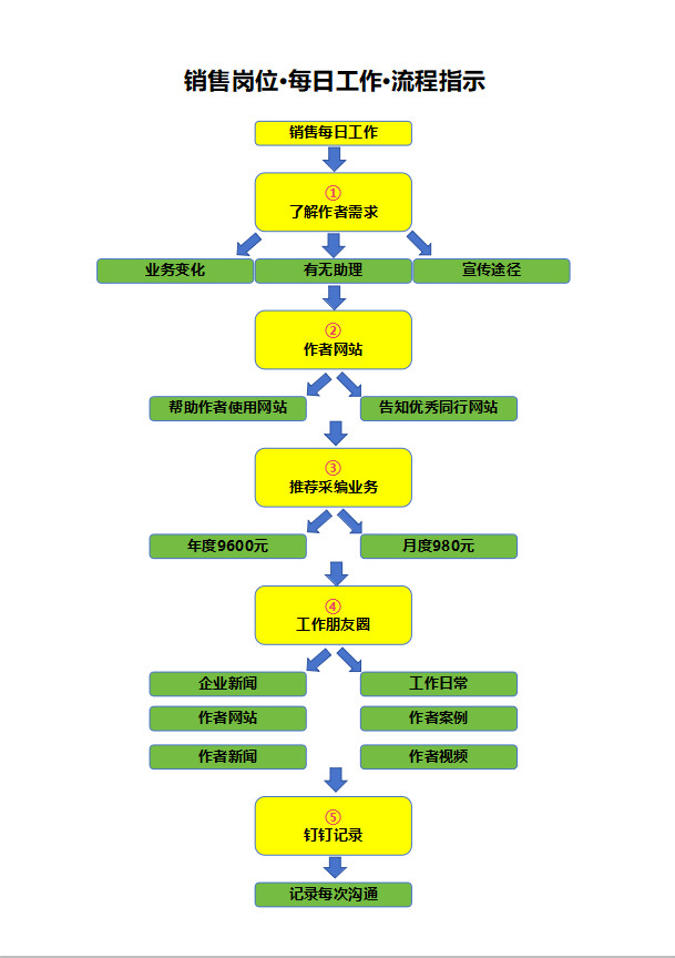 销售岗位的每日工作流程,以 “了解作者需求 - 引导使用作者网站 - 推荐采编业务 - 同步工作动态 - 记录沟通内容” 为核心逻辑,从业务变化、助理配置、宣传途径多维度切入,帮助作者熟悉平台功能,并针对性推荐月度、年度 的采编服务。同时通过朋友圈同步企业新闻、作者案例等内容,以钉钉记录全流程沟通细节。这套流程的好处在于,以需求为导向的沟通模式,既帮助作者快速了解平台服务,也为后续采编服务的落地打下了坚实基础。