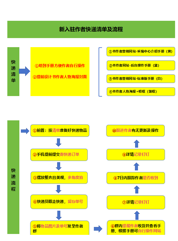 新入驻作者快递清单及流程,从前期物品准备到后期跟进记录,形成了完整的闭环服务体系。快递清单明确了采编手册、后台操作手册、标准版手册及人物海报相框等物料,流程上按 “准备物品 - 提交订单 - 拍摄留痕 - 发送单号 - 提醒收货 - 跟踪反馈 - 记录归档” 的步骤推进,每个环节都兼顾细节与效率。该流程的好处在于,既保障了物料传递的完整性,也通过全流程记录与跟进,让作者感受到细致周到的服务,快速建立对平台的信任。
