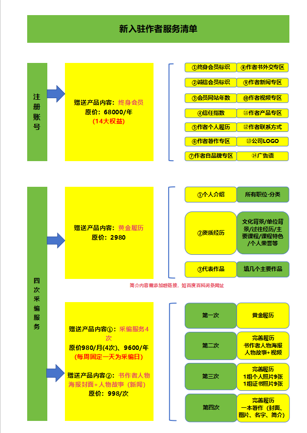 新入驻作者服务清单流程,整合了终身会员权益、黄金履历梳理、四次采编服务三大板块,终身会员包含 14 项专属权益,黄金履历完善个人品牌基础,四次采编服务则分阶段完成履历优化、海报制作、故事打造、著作呈现。整套流程从账号注册到持续服务,为新入驻作者提供了一站式 IP 孵化方案。该流程的好处在于,将零散的服务内容整合为系统化路径,让作者无需操心品牌打造的各个环节,即可享受从入驻到成长的全链路赋能。