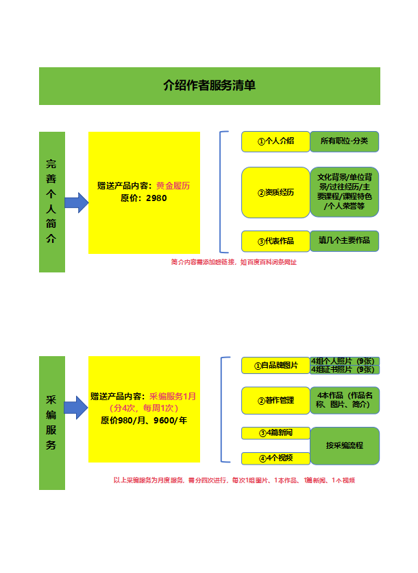 介绍作者服务清单的流程,围绕 “完善个人简介” 与 “月度采编服务” 两大模块展开。完善个人简介模块提供 “黄金履历” 服务,涵盖个人介绍、资质经历、代表作品的梳理与超链接添加;采编服务则分 4 次进行,每周完成一次图片、著作、新闻、视频的内容产出,对应原价 的服务价值。这套流程的好处在于,从个人品牌基础搭建到内容持续输出,为作者提供了阶梯式 IP 打造路径,让作者的专业形象更立体、更具传播力。