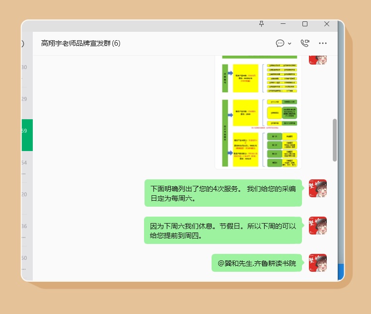 刘佳慧老师在作者群内的沟通流程,以 “提前同步采编计划 - 协调服务时间 - 明确服务内容” 为核心,主动向作者告知周度采编安排,遇到节假日等特殊情况时及时调整时间,并清晰标注服务节点。这种前置沟通的流程,打破了服务信息差,让作者对后续采编工作心中有数,同时也能及时响应作者的需求反馈。该流程的好处在于,以主动沟通替代被动等待,既提升了作者的参与感,也让采编服务的推进更顺畅、更贴合作者需求。