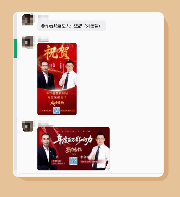 刘佳慧老师为每位签约客户设计专属签约海报,海报以红金为主色调,突出合作双方身份、服务项目与价值,搭配二维码与服务标语,兼具仪式感与传播性。每张海报都根据作者与合作类型定制,既展现了合作的重要性,也能作为作者个人品牌传播物料使用。该服务的好处在于,既为作者打造了专属的合作纪念物料,也为平台与作者的合作提供了可视化传播载体,强化了合作的价值感知与品牌记忆点。