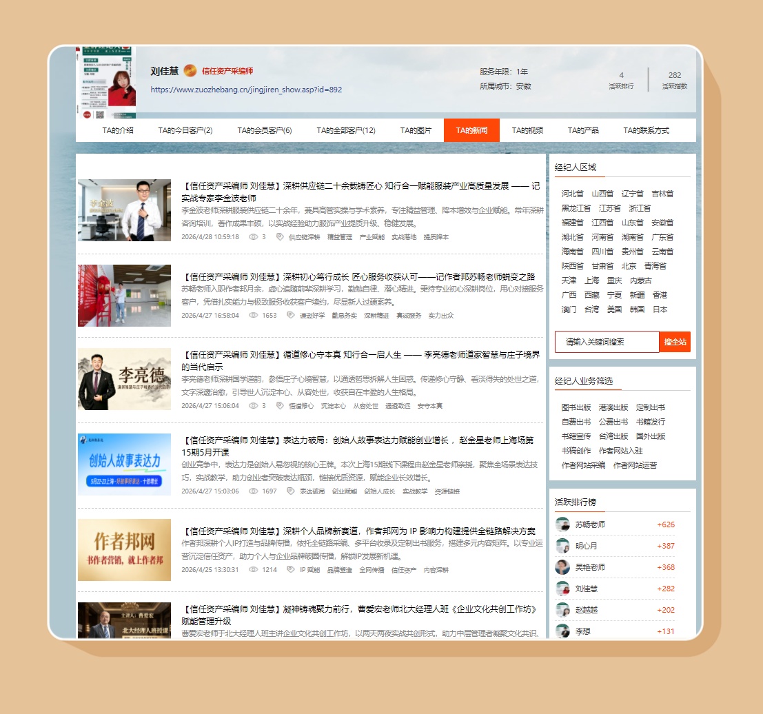 刘佳慧老师打造的作者新闻发布流程,依托作者邦平台的新闻板块,实现作者动态的多平台传播。新闻内容聚焦作者行业分享、合作动态、成长故事等主题,同步展示在作者个人主页、经纪人专区,搭配地区筛选与业务分类功能,让作者的专业观点与行业影响力被更多目标受众看见。该流程的好处在于,以权威平台为载体,将作者的专业能力转化为可传播的新闻内容,快速提升作者在行业内的曝光度与话语权。